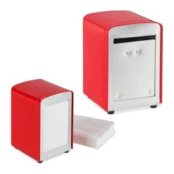Der Serviettenspender im Retro Look eignet sich ideal für die Gastronomie in Eisdielen, Kneipen oder Cafés. Sein Aussehen verleiht einen gewissen Charme, der an die American Diner der 50er Jahre erinnert. Auf dem Tisch ist der Papierspender mit Servietten immer in Reichweite, um Kleckereien schnell zu beseitigen.