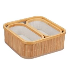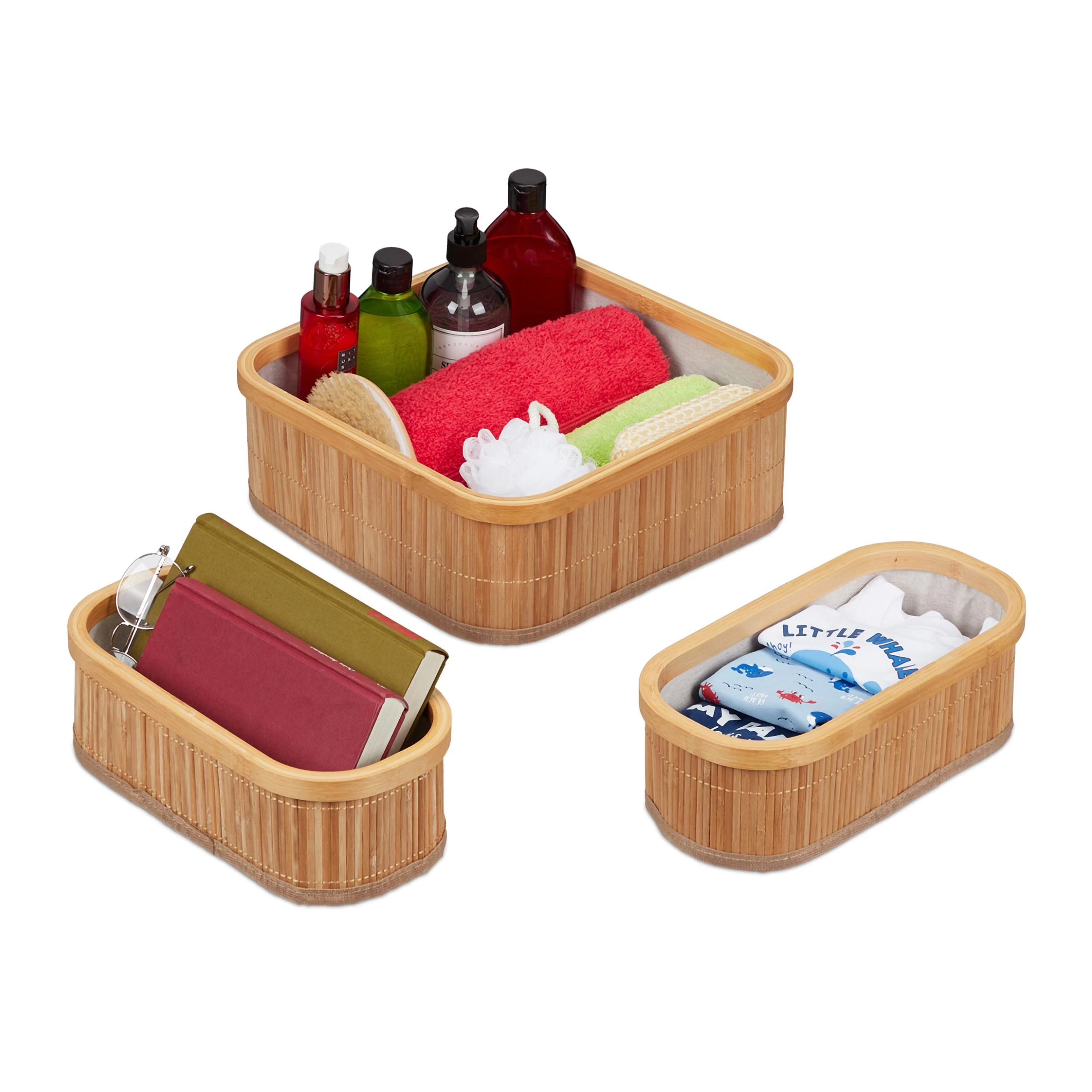 Mit den Körbchen im 3er Set holst Du Dir praktische Ordnungshelfer nach Hause. Ob als Badezimmeraufbewahrung für Kosmetik und Co, als Verstauboxen in Wohnzimmer und Flur oder Wickeltischkörbchen im Kinderzimmer – die Körbe in 2 unterschiedlichen Größen passen in jeden Raum und sorgen dort für mehr Übersicht. Dank der natürlichen Optik von Bambus und heller Einlage werden die Badkörbe dabei zum Hingucker. Bei Nichtgebrauch können die Bambuskörbe platzsparend ineinander gestapelt werden.