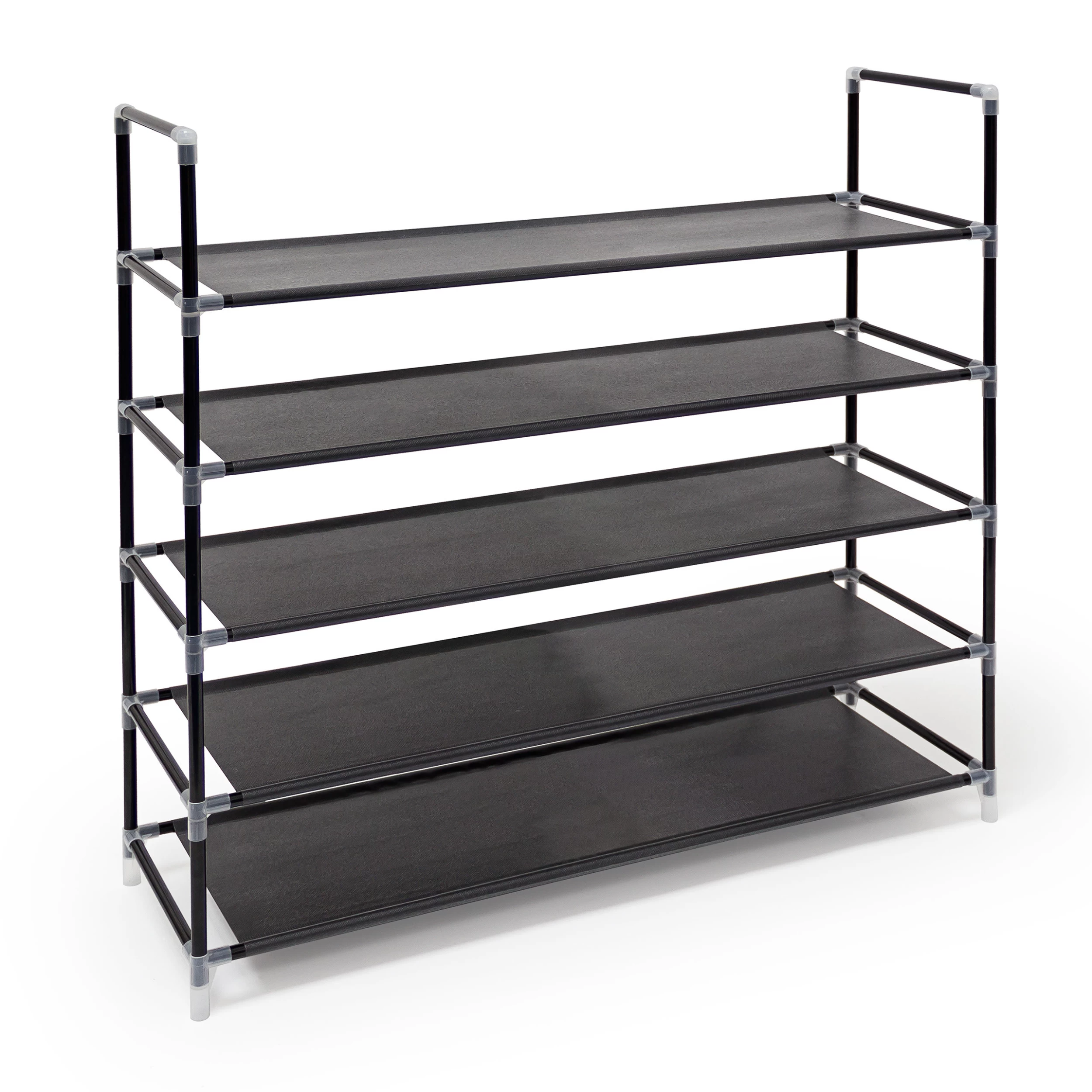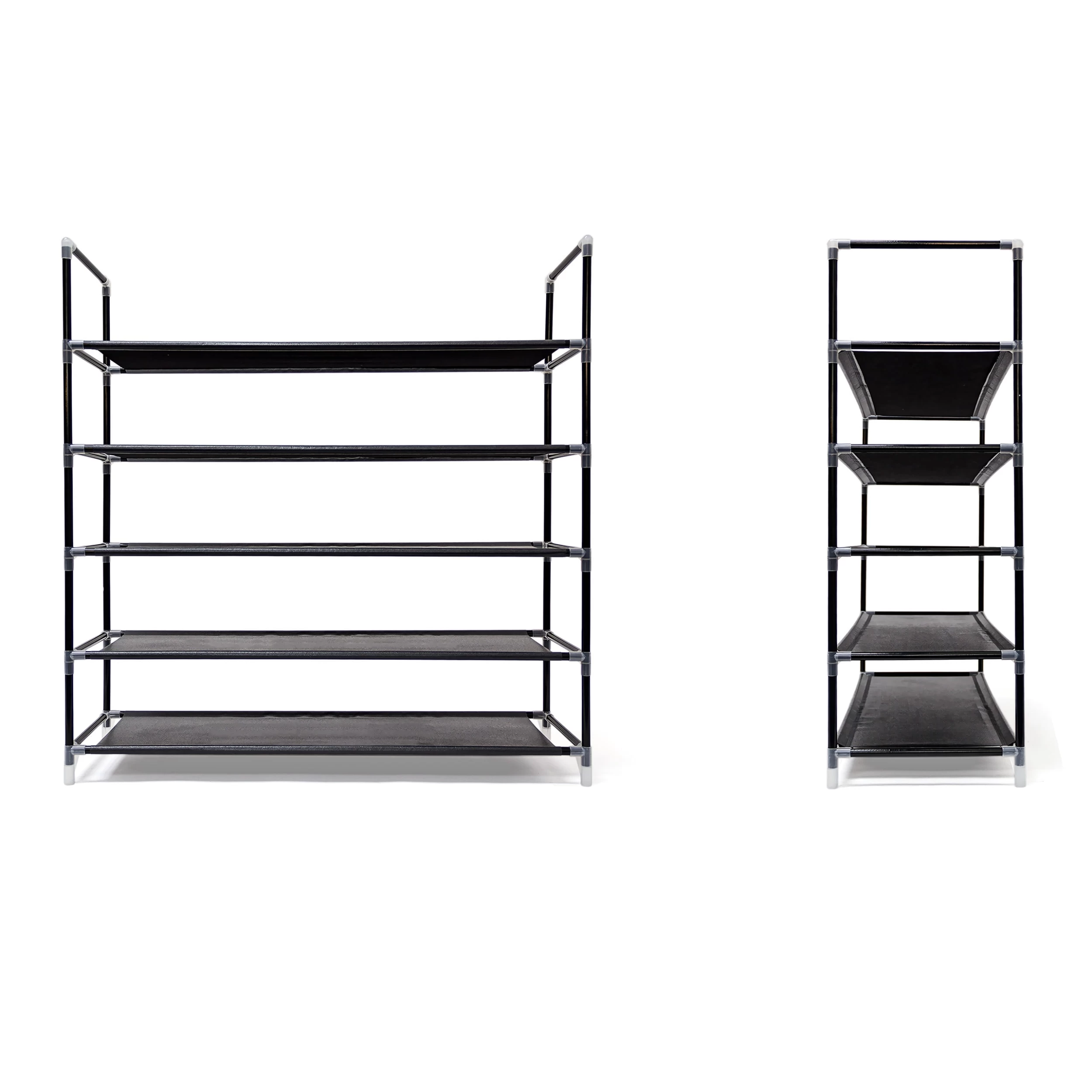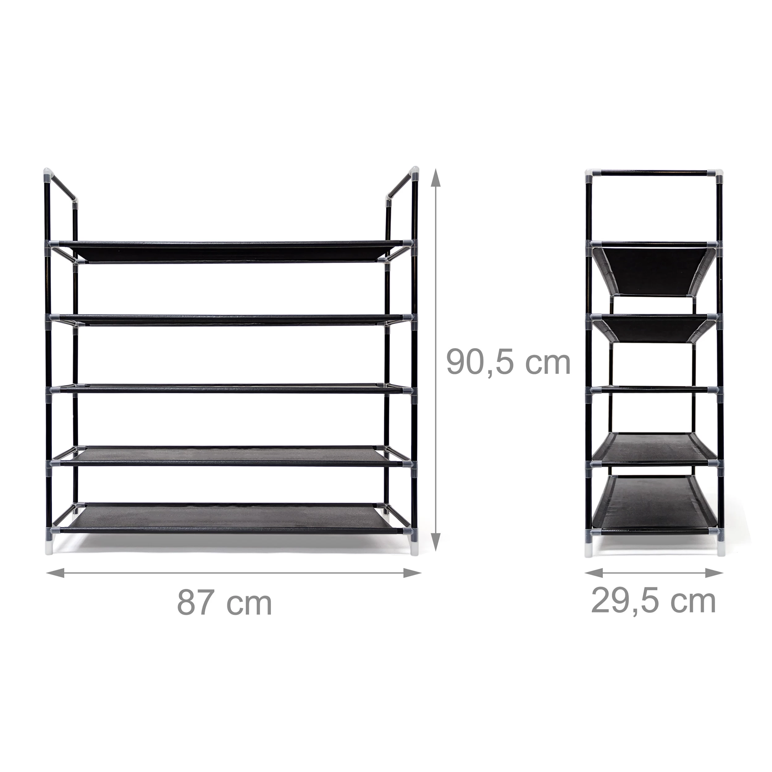 Diese Schuhablage bietet idealen Stauraum für den Flur oder das Treppenhaus. Auf den 5 breiten Ablagen aus Vlies können insgesamt – je nach Größe – bis zu 20 Paar Schuhe abgestellt werden. Das Gestell aus Stahlrohr macht das Schuhregal sehr leicht und gleichzeitig äußerst stabil. Dank der beiden Griffe ist es damit bei Bedarf leicht zu bewegen. Der Aufbau ist durch das simple Stecksystem auch für eine Person schnell erledigt. Diese Konstruktion kann beliebig erweitert werden. Bauen Sie 2 Regale übereinander oder lassen Sie Ablagen weg – bis Sie Ihre persönliche Wunsch-Höhe haben.