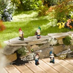 Sie sind Klassiker und Blickfang in jedem Garten und kommen einfach nicht aus der Mode – Gartenzwerge! Mit diesem Set erhältst Du gleich 4 drollige Wichtel, welche Du im Beet, auf Balkon oder Terrasse gekonnt in Szene setzen kannst. Die originellen Gnome sind mit den typischen Merkmalen wie Zipfelmütze und Rauschebart versehen und spielen vergnügt verschiedene altertümliche Instrumente. Gerne kannst Du die Dekofiguren ganzjährig draußen stehen lassen, da sie aus wetterfestem Kunststein sind.