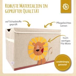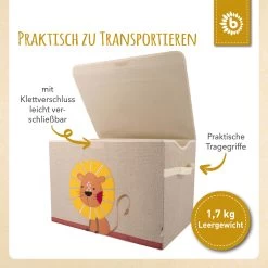 Diese schöne Spielzeugbox von Bieco bringt Ordnung ins Kinderzimmer. Im niedlichen Löwenmotiv bereitet sie Kindern und Eltern viel Freude. Die Dekorative Kiste hat einen Deckel zum Aufklappen, der sich mit einem Klettverschluss leicht verschließen lässt. Wird die Aufbewahrungsbox einmal nicht benötigt, kann sie einfach zusammengefaltet werden und verschwindet platzsparend im Schrank. Dank der Tragegriffe an der Seite der Box lässt sie sich spielend einfach transportieren. Die schöne Box hat eine Größe von etwa 36x36x51 cm und hat ein Fassungsvermögen von etwa 65 Liter. Der Aufbewahrungskorb Kinder ist durch seine Oberfläche aus Polyester besonders pflegeleicht und robust. Entdecke auch unsere weiteren Aufbewahrungsboxen mit Deckel für das Kinderzimmer in passenden Designs mit Wal, Esel oder Reh. Die Marke BIECO steht seit vielen Jahren für höchste Qualität und innovative Produktentwicklung. Unsere Spielwaren für Babys und Kleinkinder unterliegen allesamt den strengsten Richtlinien deutscher Produkt- und Sicherheitsstandards. BIECO möchte Kindergesichter zum Strahlen bringen, deshalb werden alle Designs für unsere Kleinen mit Liebe gefertigt.