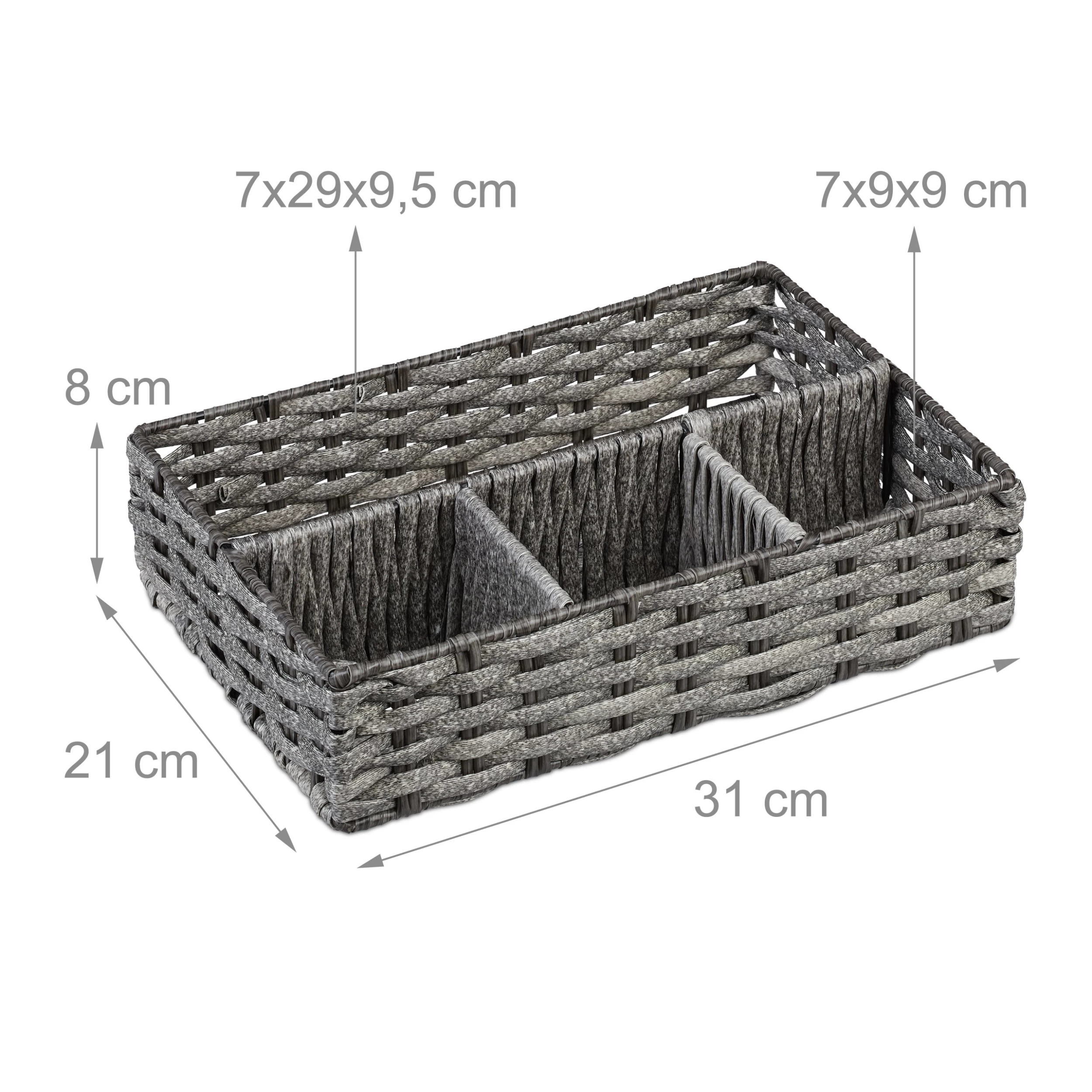 Wenn die Badablage oder der Wannenrand überfüllt sind, schafft dieser Flechtkorb Ordnung im Badezimmer. Doch der Aufbewahrungskorb ist nicht nur für das Bad geeignet. Im ganzen Haus hält die Aufbewahrungskiste die Dinge des Alltags übersichtlich an ihrem Platz. Der Dekokorb ziert das Schlafzimmer als Sockenkorb oder wird als Schubladen Organizer für den Schreibtisch genutzt. Dank der 4 Fächer können Sie verschiedene Utensilien aufbewahren, ohne dass diese durcheinander geraten.