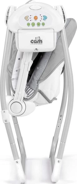 Gemütliche Schaukel, Aktivitäts-Spiel und Baby-Sitz in einem. Mit der Babyschaukel Cam Sonnolento kommt ein Multitalent für den Alltag mit Baby nachhause. Die niedliche Schaukel ist mit einem 5-Punkt-Sicherheitsgurt und rutschhemmenden Gummistoppern an der Unterseite für ein hohes Maß an Sicherheit ausgestattet. Der weiche Bezug und das gepolsterte Kissen sorgen für einen komfortablen Sitz in jedem Modus. Die kleinen Stofftiere am Dach, die anpassbaren Einstellungen und die verschiedenen Sound-Möglichkeiten sorgen für großes Vergnügen bei den Kleinsten.