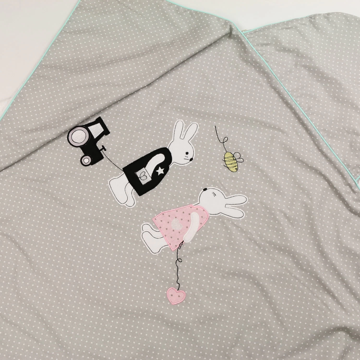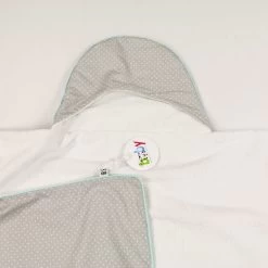 kleine weiße Pünktchen auf grau / Innenseite aus Frottee/ Paspelband in mint