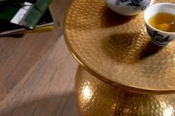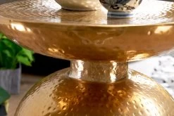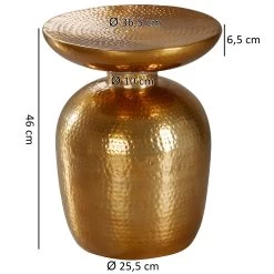 Design Extravaganter, dekorativer Tisch im orientalischen Design mit außergewöhnlicher Form Ablagefläche bietet Platz für z. B. Dekoration, Blumen & Co. Wunderschöne Hammerschlag-Strukturen machen den Tisch zu einem absoluten Highlight Abmessungen Breite: 36,5 cm Höhe: 46 cm Tiefe: 36,5 cm Durchmesser der Ablagefläche: 36,5 cm Durchmesser der Standfläche: 25,5 cm Besonderheiten Durch liebevolle Handarbeit ist jeder Beistelltisch ein absolutes Unikat Da die Unterkante nach innen gefalzt ist, werden unschöne Kratzer im Boden vermieden Hohe Stabilität durch das hochwertig verarbeitete Aluminium und die runde Form Material Aluminium Lieferumfang 1 Beistelltisch ohne Dekoration Montage Lieferzustand: montiert und sicher verpackt Pflegehinweise Die Oberfläche mit einem lauwarm angefeuchteten Baumwolltuch reinigen. Bitte keine harten Bürsten oder Metallschwämme verwenden, da diese Kratzer im Metall verursachen. Keine Scheuermittel, scharfen Reinigungsmittel oder tropfnassen Tücher verwenden.