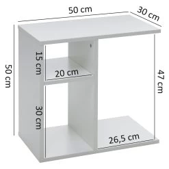 Design Kleiner Beistelltisch in modernem Design Zwei praktische Ablagefächer Großzügige Abstellfläche für diverse Gegenstände Abmessungen Breite: 50 cm Höhe: 50 cm Tiefe: 30 cm Maße kleines Fach oben (BxHxT): 20 x 15 x 30 cm Maße großes Fach unten (BxHxT): 20 x 30 x 30 cm Abstand zwischen Ablagefläche und Bodenplatte: 47 cm Materialstärke: 1,5 cm Besonderheiten Kratzfeste Oberfläche dank der Melaminharz-Beschichtung Durch das Melaminharz ist der Sofatisch zudem wasserabweisend Zwei Ablagefächer für Fernbedienung, Fernsehzeitschriften und Co. Großzügige Abstellfläche bietet Platz für Getränke, Snacks und Ihr Handy Material Folierte Spanplatte Lieferumfang Ein Beistelltisch ohne Dekoration Montageanleitung & -material inklusive Montage Lieferzustand: Zerlegt und praktisch verpackt Pflegehinweis Mit feuchtem Tuch abwischen, mit trockenem Tuch nachwischen. Bei Bedarf mildes Reinigungsmittel benutzen. Keine scharfen oder lösungsmittelhaltigen Reiniger verwenden.