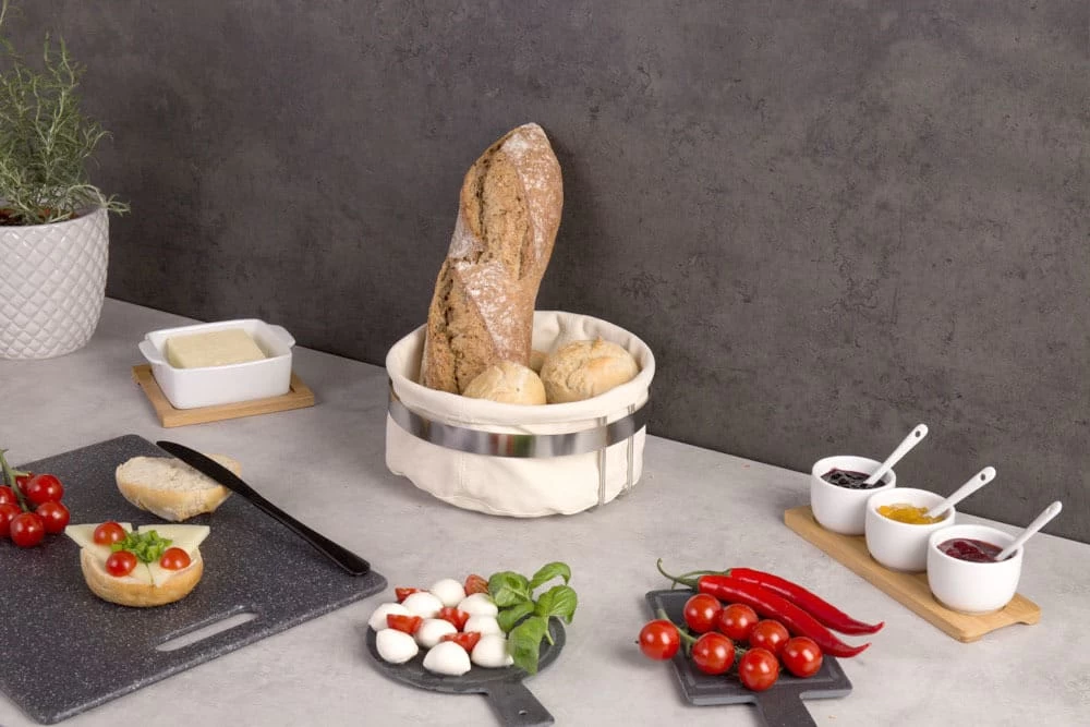 Ein eleganter Korb für Brot, Brötchen oder Obst. Es ermöglicht Ihnen, Tischbeläge bequem zu servieren. Es ermöglicht einen schnellen Zugriff auf Inhalte. Es wird den Transfer erleichtern. Leicht und solide gemacht. Die Metallkonstruktion sorgt für Stabilität. Strapazierfähiges Baumwollgewebe – kann bei Temperaturen bis 30 ° C von Hand gewaschen werden.