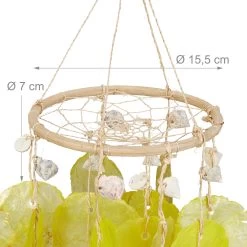 Neben den echten Capizmuscheln finden sich auch weiße, leere Schneckenhäuser am Anfang der Capiz-Girlanden. Durch das Traumfängernetz, welches im Holzring gespannt ist, wirkt das Muschel Windspiel besonder harmonisch und dekorativ.