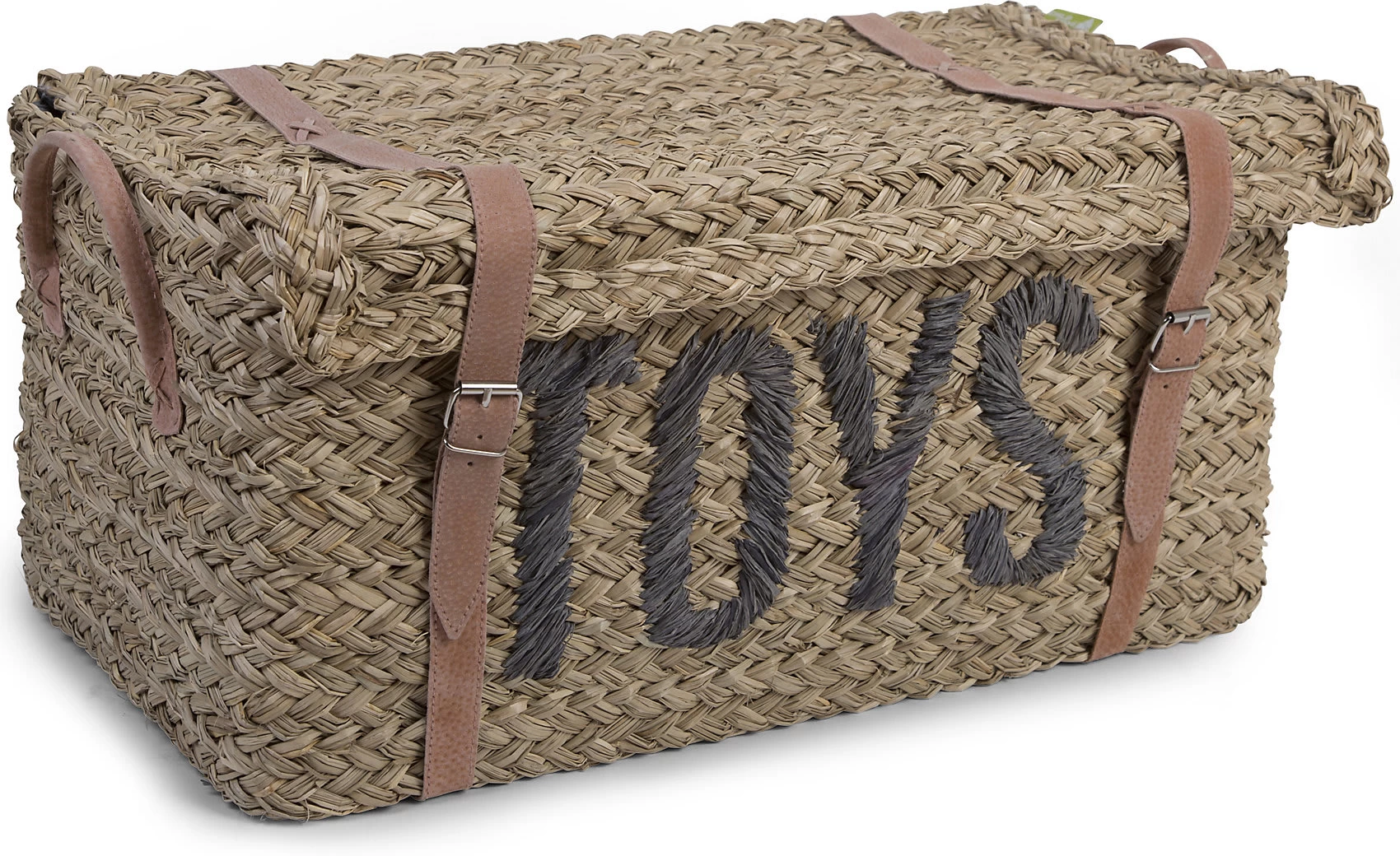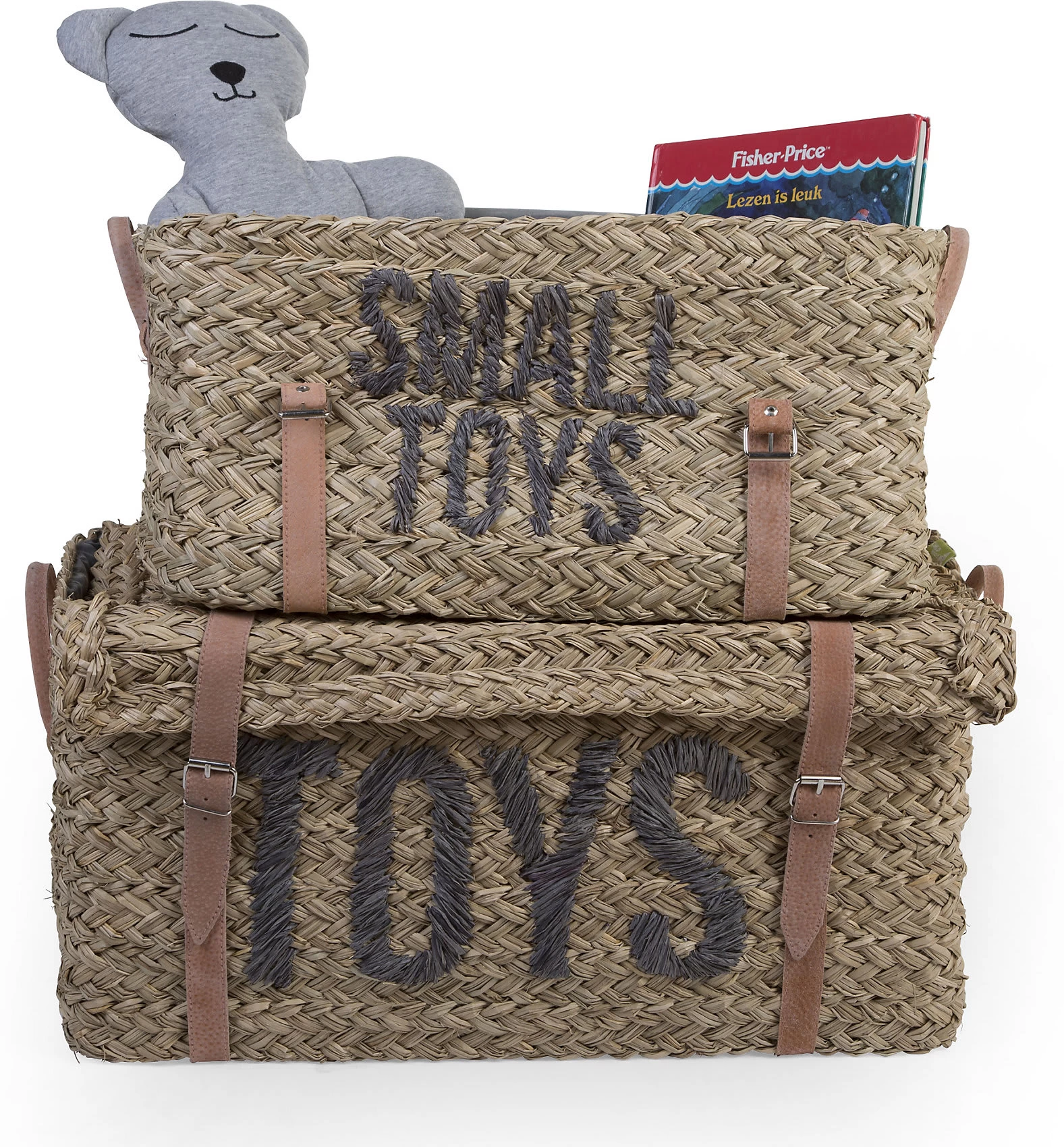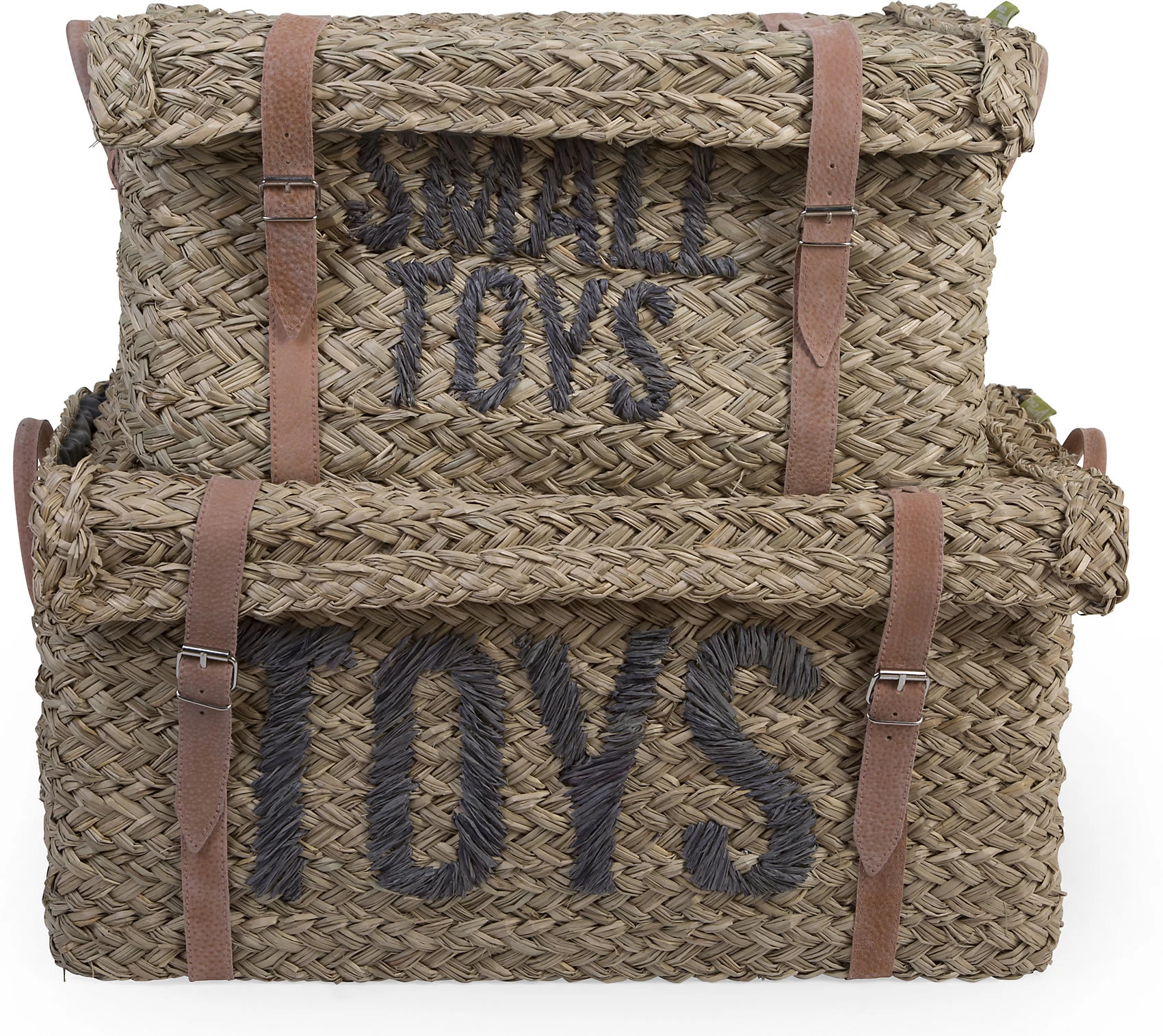 Die süßen Aufbewahrungsboxen von Childhome bieten viel Platz für großes und kleines Spielzeug. 2 Aufbewahrungsboxen von Childhome in zwei Größen Rattan aus Seegras, Verschlussriemen und Griffe aus Leder Die Boxen sind aus Seegras gefertigt, was ihnen einen coolen Landhaus-Look verleiht. Die niedlichen Aufschriften machen die Boxen zu echten Highlights im Babyzimmer. Dank praktischer Lederriemen sind die Boxen verschließbar; die Ledergriffe erlauben ein kinderleichtes Umstellen. Die Boxen können mit einem feuchten Tuch abgewischt werden.