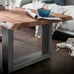 Der Couchtisch ist aus massivem Akazienholz zum Großteil in liebevoller Handarbeit hergestellt. Die Oberfläche von dem Couchtisch ist in Natur Braun geölt. Durch die besondere Oberflächenbehandlung der Tischplatte bleibt die Holzstruktur sichtbar und macht das Möbel durch seine einzigartige Maserung zu einem Unikat in Ihrem Wohnzimmer. Die Eigenschaften der Akazie eignen sich besonders für den Möbelbau, da es sich hierbei um ein besonders hartes Holz handelt. Die Kombination Couchtisch – Platte mit Baumkanten und dem U - Metallgestell vereinen den modernen Wohnstil mit dem Vintage – Stil.
