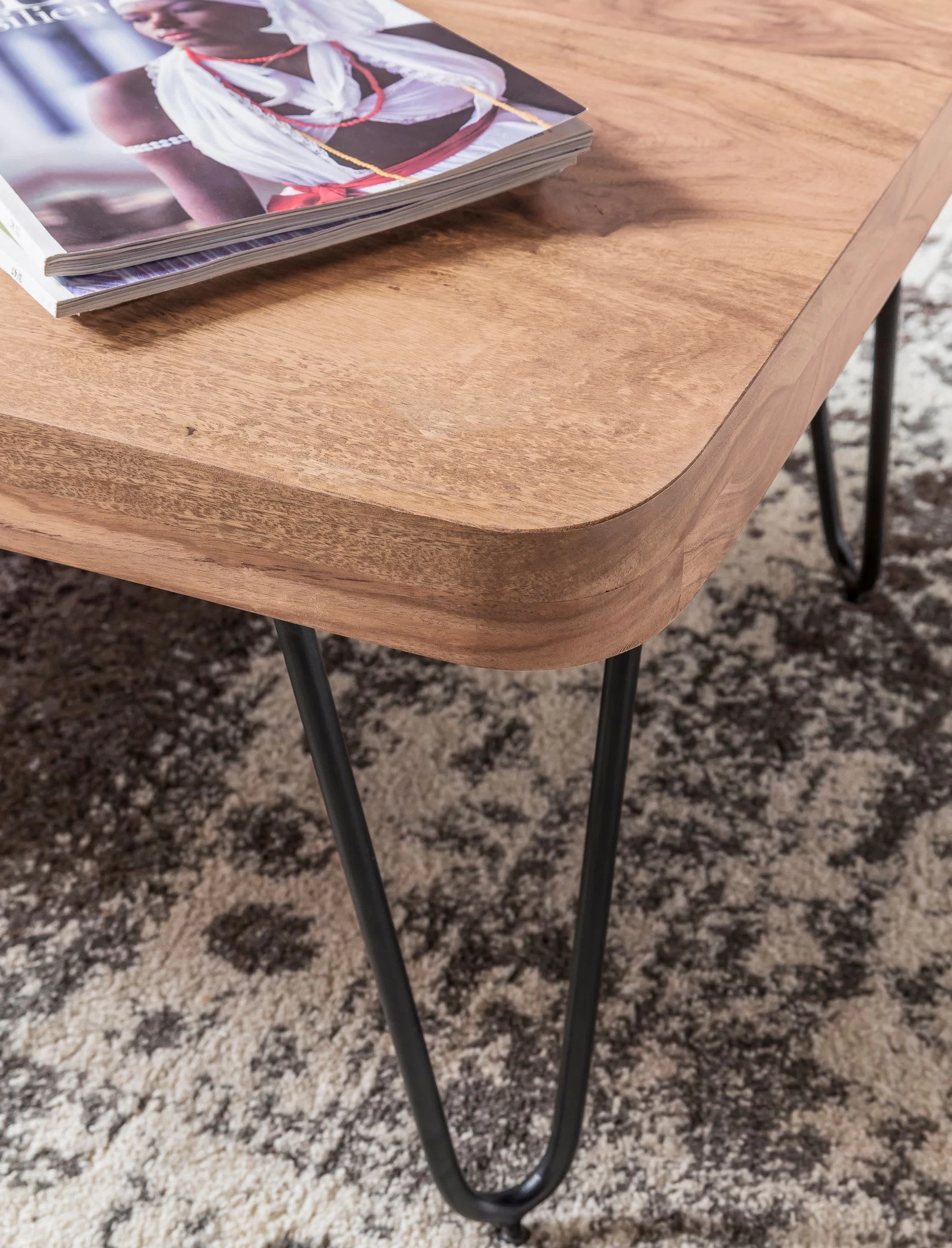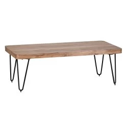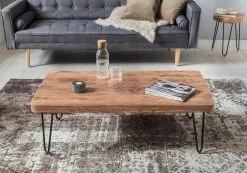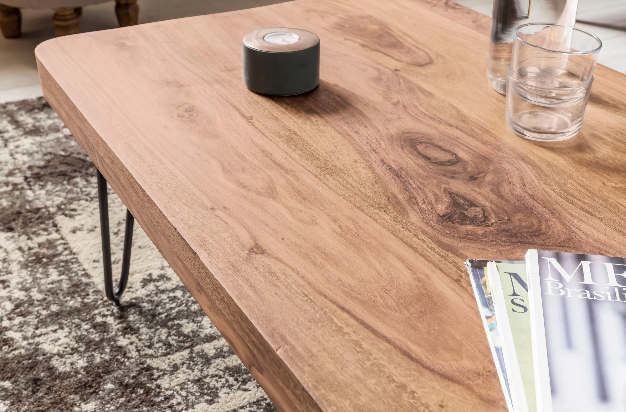 Design Couchtisch im modernen und schlichten Design Rechteckige Form mit abgerundeten Kanten Eindrucksvolle Maserung der Tischplatte schafft eine warme Atmosphäre Anmutige Metallbeine halten die Tischplatte Abmessungen Breite: 115 cm Höhe: 40 cm Tiefe: 60 cm Tischplattenstärke: 2,5 cm Weitere Abmessungen finden Sie im Maßbild Maximale Belastbarkeit: 50 kg Besonderheiten Kleinere Risse, Astlöcher und Farbunterschiede sind typisch für Massivholz, da es sich um ein Produkt der Natur handelt Jeder Tisch ist von Hand gefertigt – dadurch kann es zu Unebenheiten kommen, die jeden Couchtisch zu einem Unikat machen Durch seine einzigartige Holzmaserung ist jeder Tisch ein absolutes Unikat Fester Stand dank der Metallbeine Material Tischplatte: Massivholz Tischbeine: lackierter Edelstahl Lieferumfang Ein Couchtisch ohne Dekoration Leicht verständliche Montageanleitung inkl. Montage Lieferzustand: teilmontiert, lediglich die Beine sind noch an die Tischplatte anzubringen Pflegehinweise: Die Holzoberfläche am besten mit einem lauwarmen, leicht angefeuchteten Baumwolltuch abwischen und Restfeuchtigkeit mit einem fusselfreien Lappen entfernen.