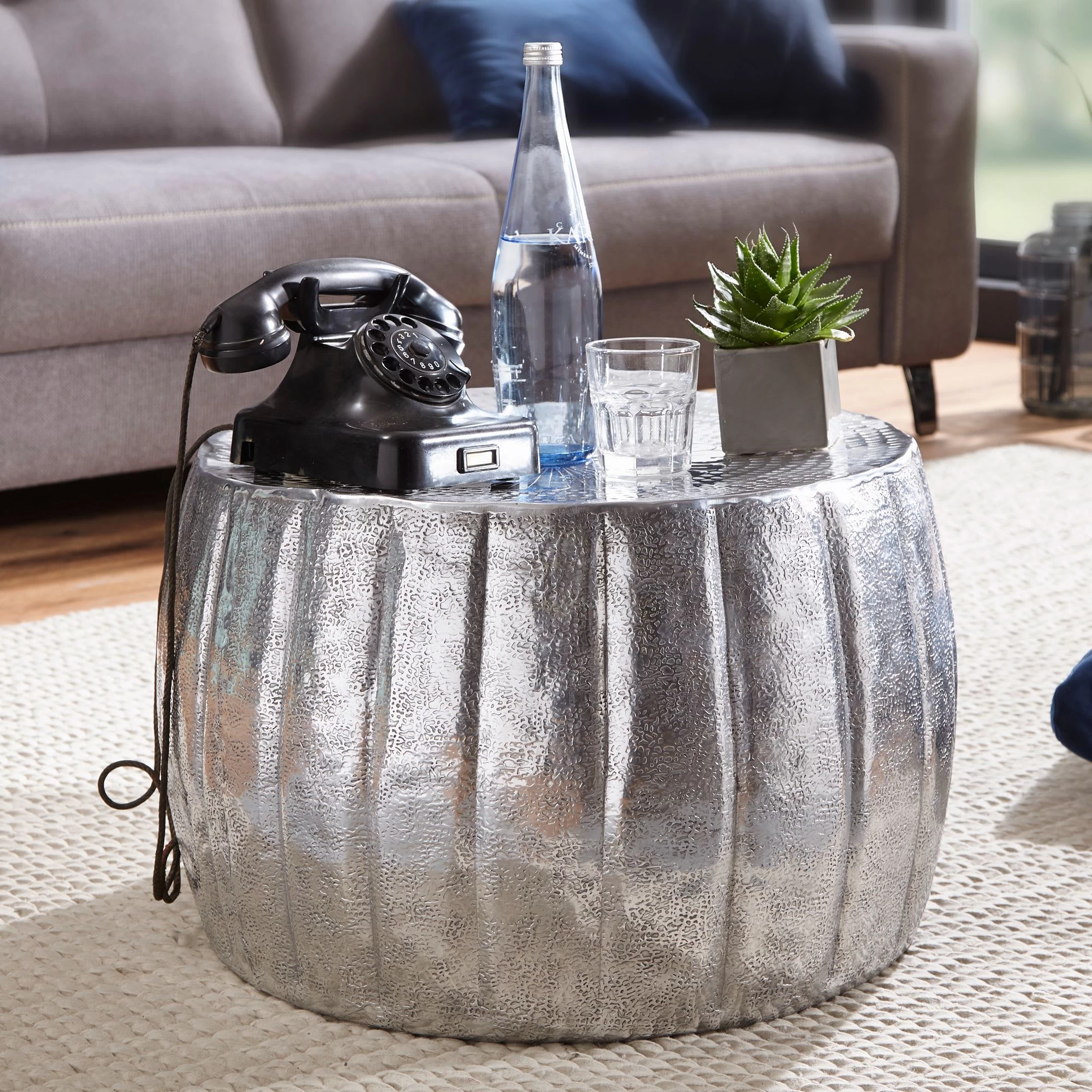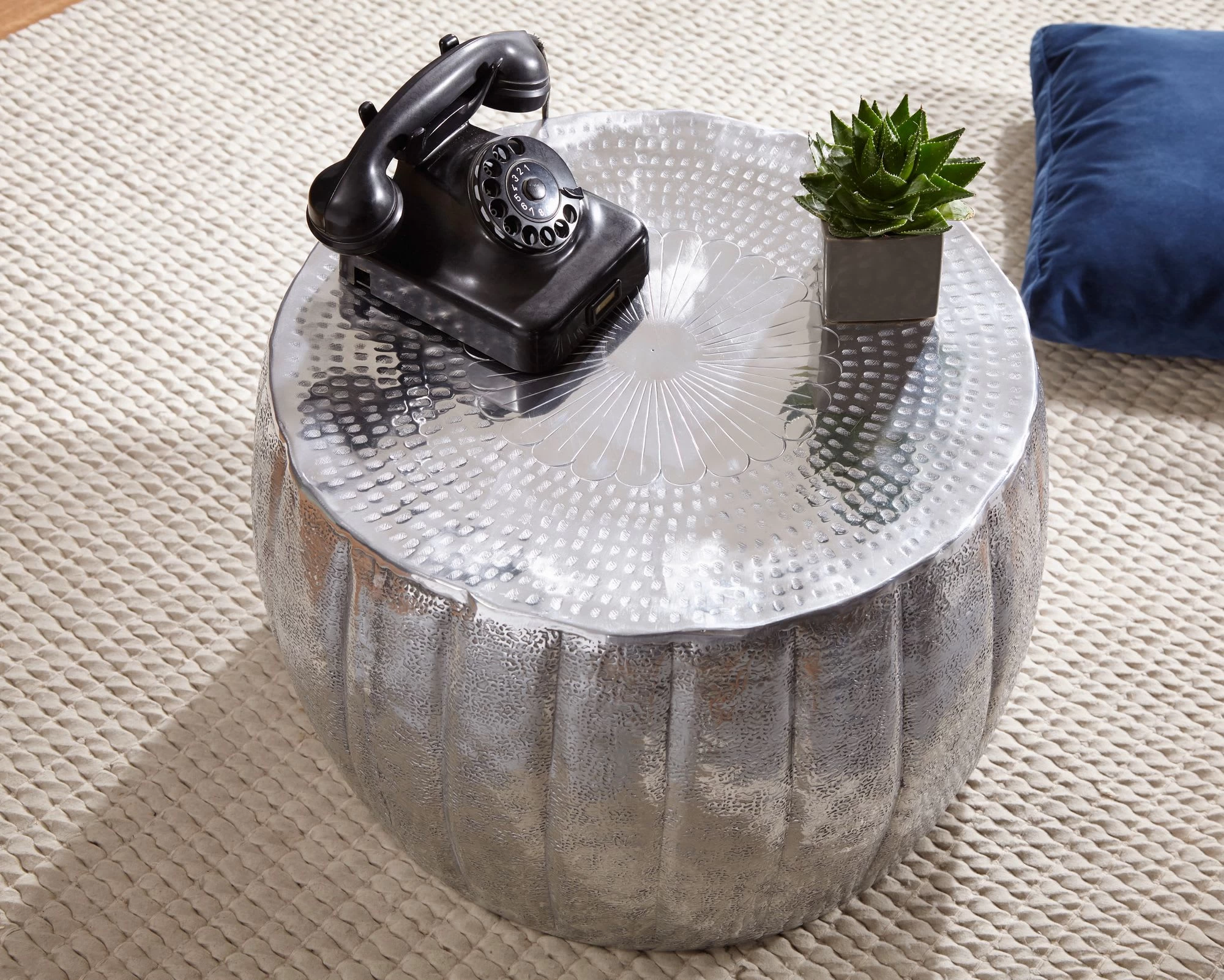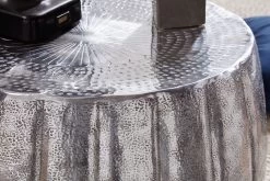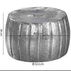 Design Außergewöhnlicher Couchtisch im orientalischen Design Ablagefläche bietet Platz für z. B. Fernbedienung, Zeitschriften & Co. Wunderschöne Strukturen machen den Tisch zu einem absoluten Highlight Ein formschönes Bildzeichen schmückt die Ablagefläche Abmessungen Breite: 60 cm Höhe: 36 cm Tiefe: 60 cm Durchmesser der Ablagefläche: 52,5 cm Besonderheiten Durch liebevolle Handarbeit ist jeder Tisch ein absolutes Unikat Da die Unterkante nach innen gefalzt ist, sind scharfe Kanten vermieden worden Hohe Stabilität durch das hochwertig verarbeitete Aluminium und die runde Form Aufgrund der Handarbeit machen einzelne kleine Dellen die Tische zu absoluten Einzelstücken Material Farbig lackiertes Aluminium Lieferumfang 1 Couchtisch ohne Dekoration Montage Lieferzustand: montiert und sicher verpackt Pflegehinweise Die Oberfläche mit einem lauwarm angefeuchteten Baumwolltuch reinigen. Bitte keine harten Bürsten oder Metallschwämme verwenden, da diese Kratzer im Metall verursachen. Keine Scheuermittel, scharfen Reinigungsmittel oder tropfnassen Tücher verwenden.