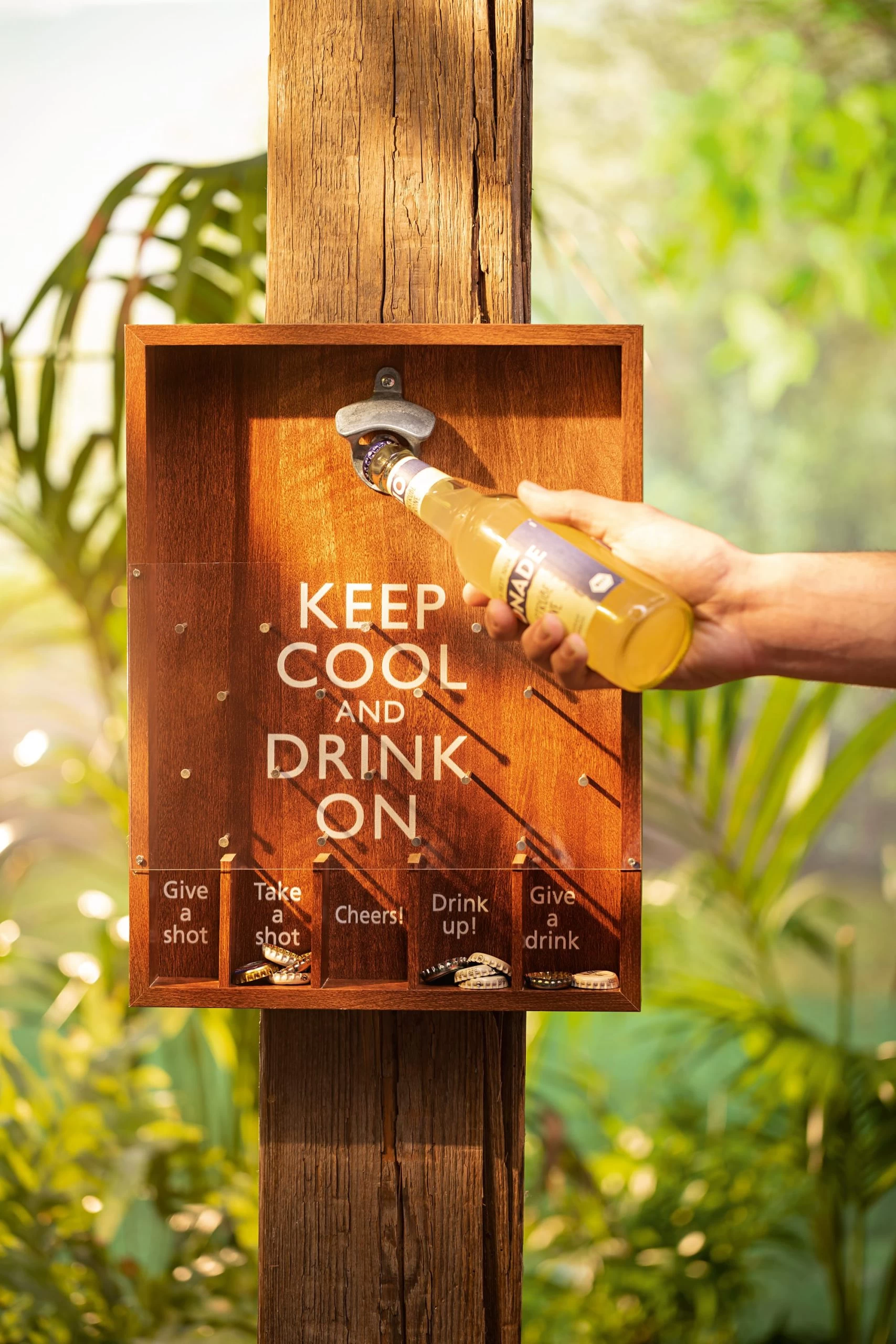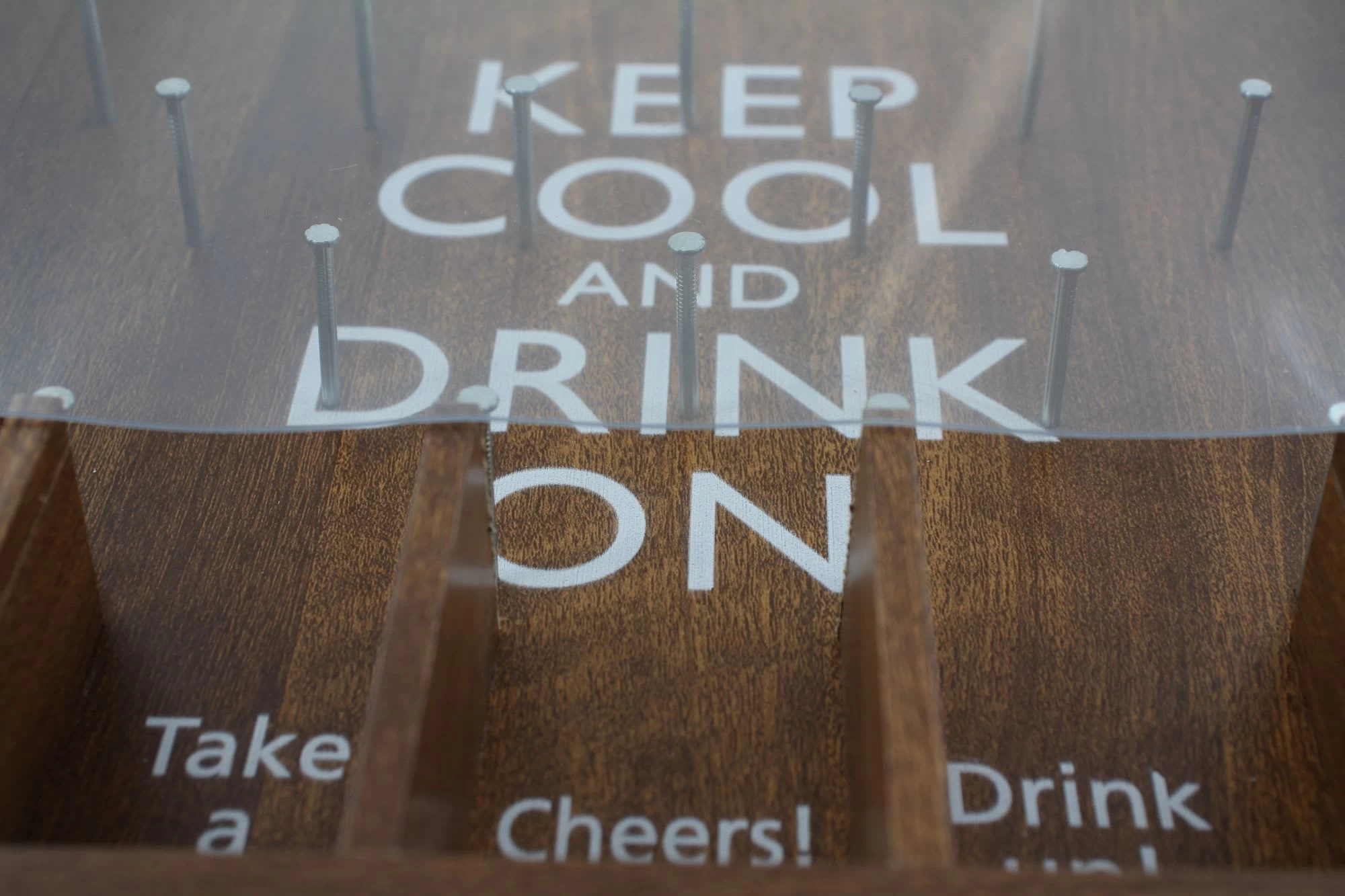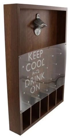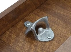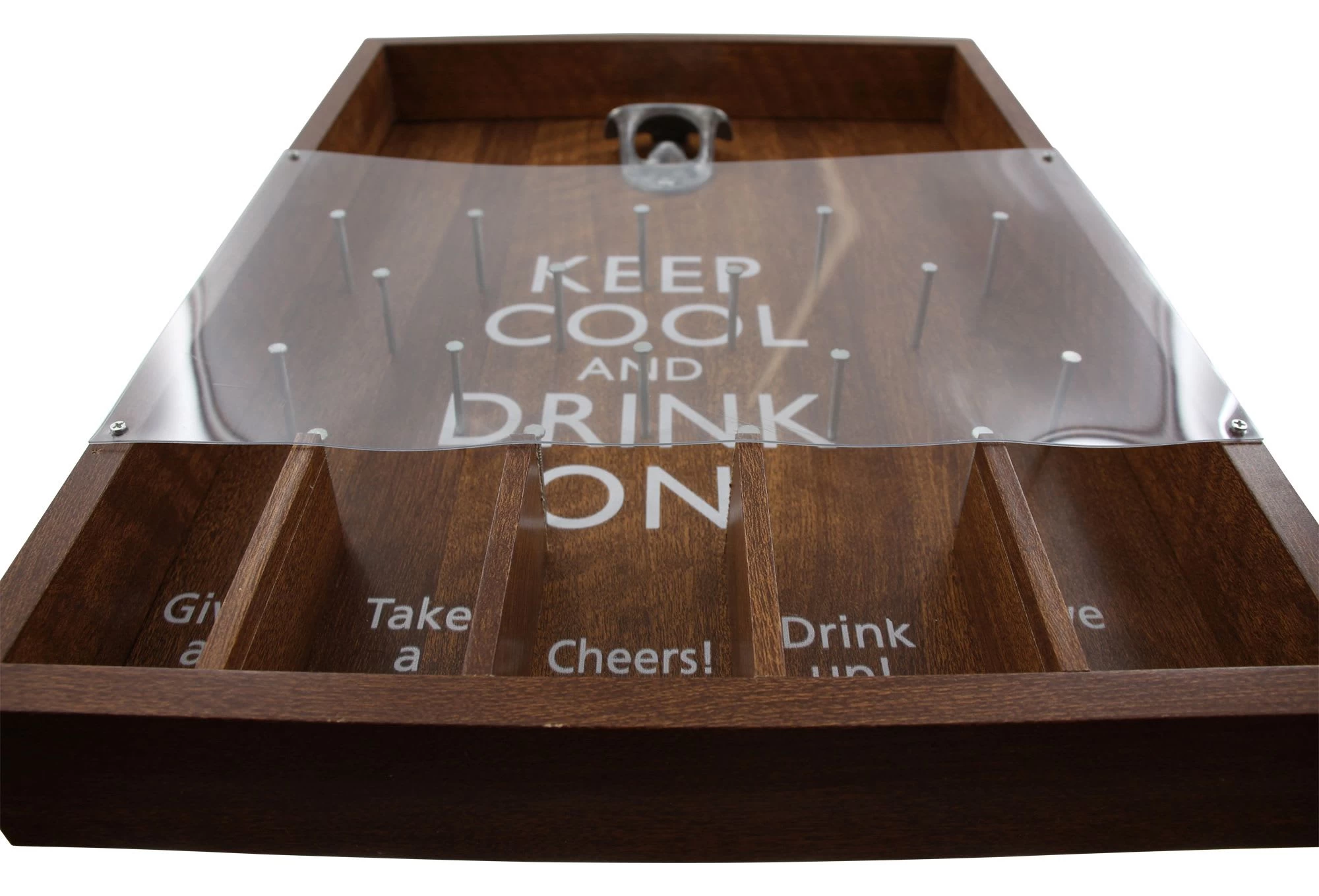 lustiger Partyknaller, stabiler Holzkasten in Braun, Metallstifte und Flaschenöffner, Kunststoffabdeckung