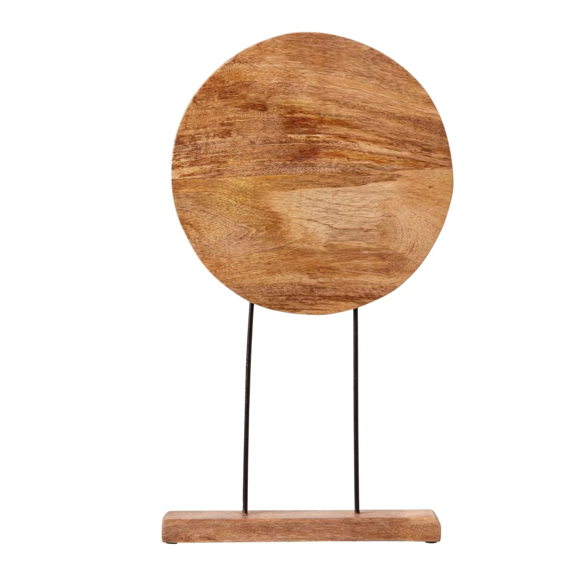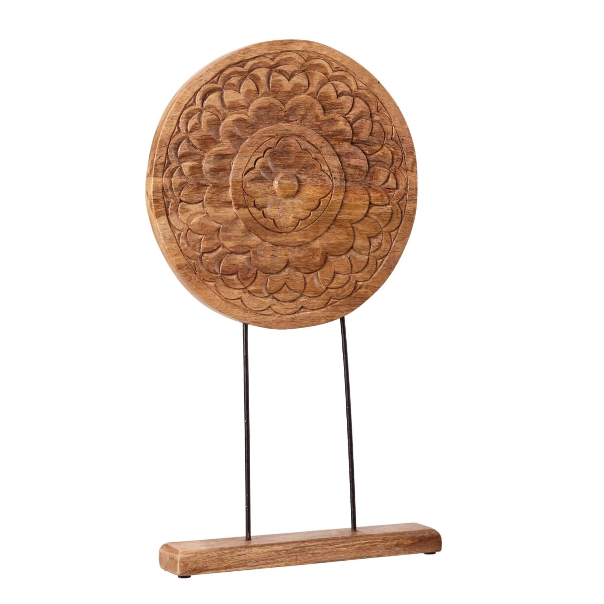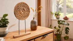 Rundes Ornament in Mandala-Optik zum Stellen. Das Ornament ist kunstvoll aus Mangoholz gearbeitet und wird von zwei Metallstangen gehalten, die auf einen Holzsockel montiert sind. So kommt das Dekoobjekt besonders gut zur Geltung und wird zum absoluten Hingucker auf der Fensterbank, dem Sideboard oder dem Kaminsims.