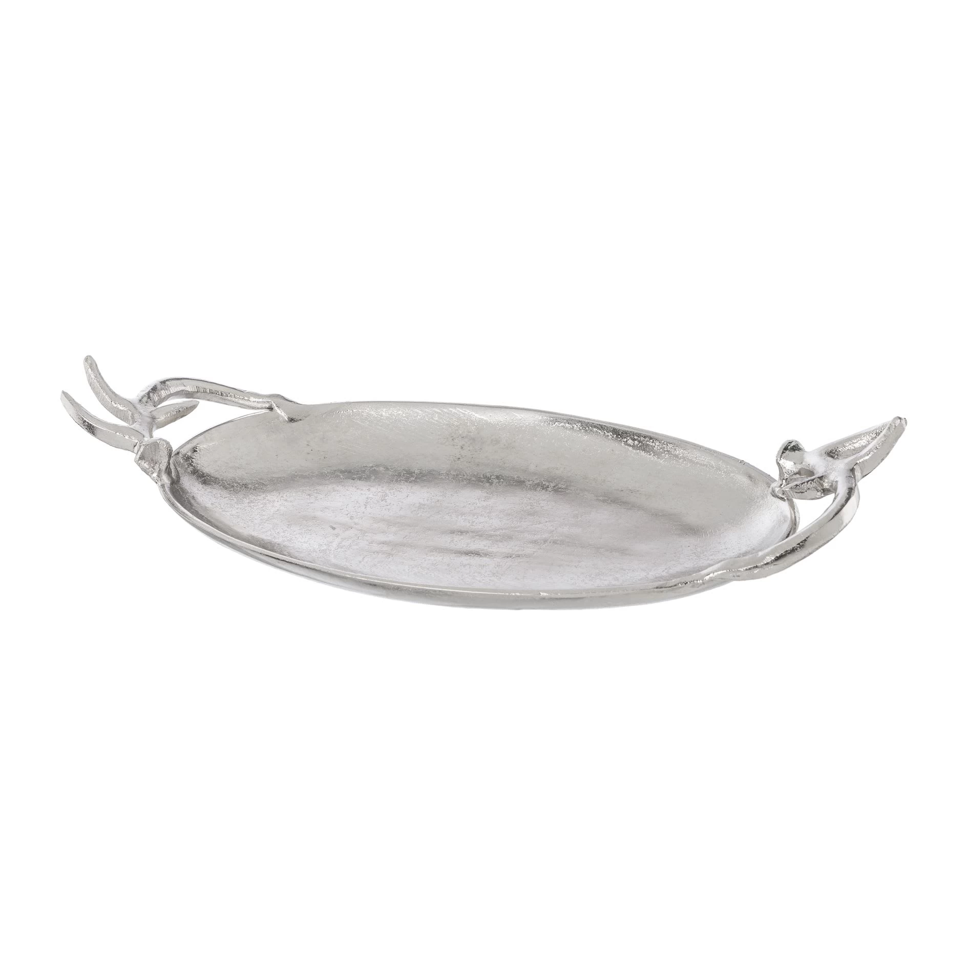 Die flache Schale ist aus Aluminium und mit liebevollen Details gearbeitet. An den Griffen der Schale sind kleine Verzierungen angebracht, die an ein Hirschgeweih erinnern. Durch ihre ovale Form eignet sie sich auch gut als Tablett, auf dem Du z.B. Dein Adventsgebäck anrichten können. Auch zu Dekozwecken ist die silberen Schale perfekt gegeignet. Wenn Du es gemütlich magst und den Landhausstil liebst, dann stelle Teelichter auf das Tablett, ergänze ein paar Zweige und Weihnachtsbaumkugeln dazu und die weihnachtliche Deko ist perfekt. Die MAße des Schale betragen 40x19x7cm.
