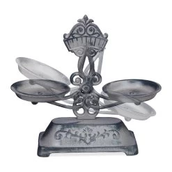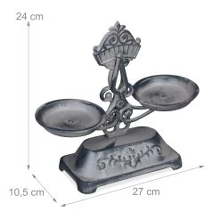 Die Deko Waage ist ein heißer Tipp, falls Sie Accessoires im nostalgischen Stil lieben. Die Antik Küchenwaage brilliert mit altmodischer Verspieltheit. Die floralen Verzierungen am Sockel oder auch an der Anzeige tragen zu einem gemütlichen Wohnambiente bei. Da die Doppelwaage komplett aus Gusseisen gefertigt ist, hat sie eine rustikale Oberfläche, die sie älter wirken lässt, als sie ist. Was die bereits fertig montierte Doppelwaage vervollständigt, sind die Gewichte in 3 verschiedenen Größen.