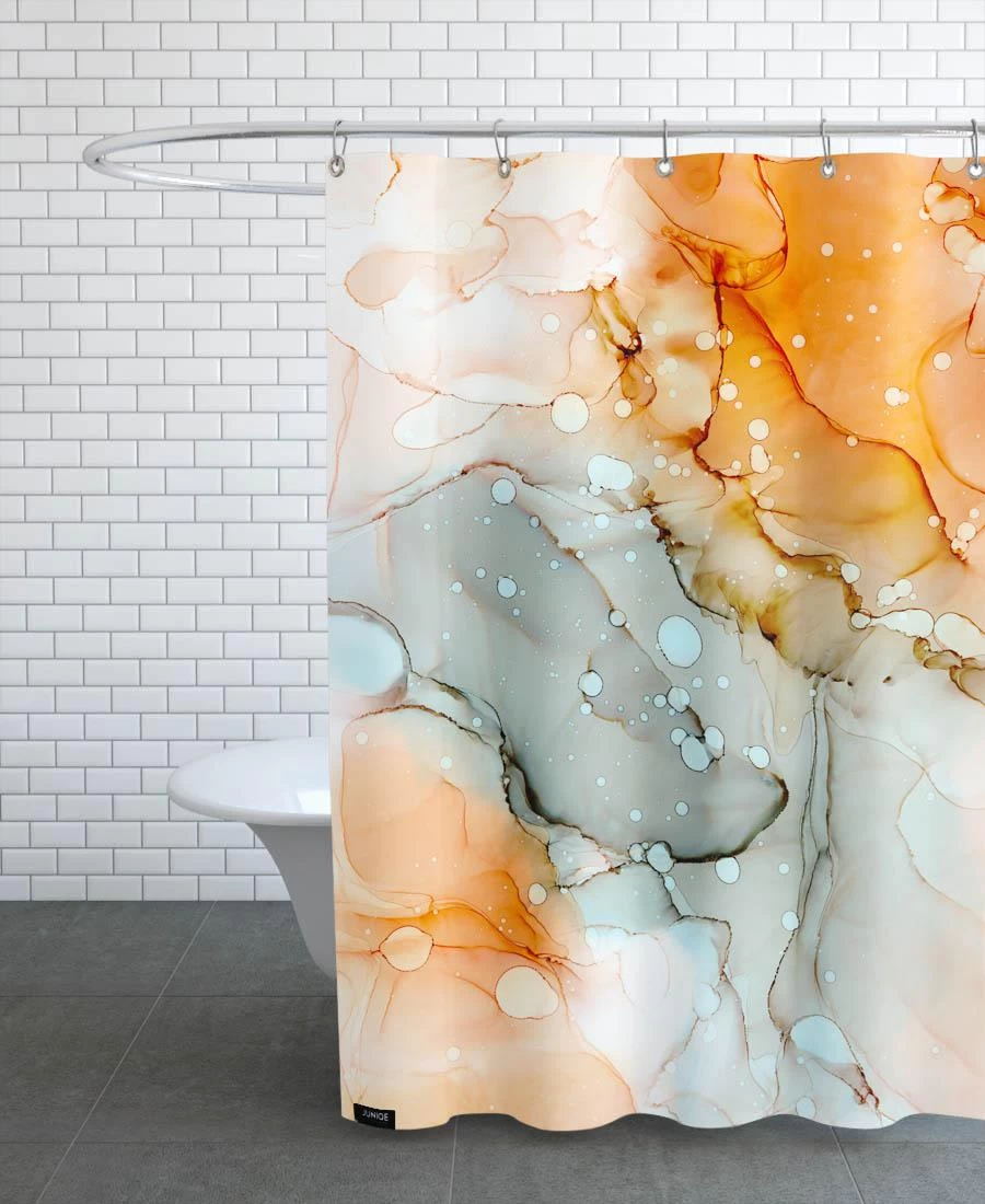 Wasserabweisender Duschvorhang aus Polyester mit einseitigem Motivdruck. Fadenvernäht. Mit vernickelten, rostfreien Metallösen. Aufhängung (Duschvorhangringe) nicht inklusive.