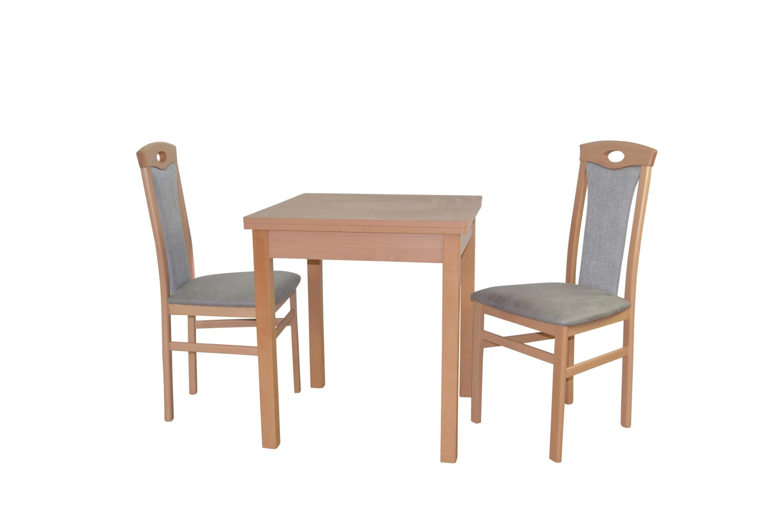 Hochwertige 3tlg. Essgruppe bestehend aus 2 Massivholzstühlen und 1 Esstisch mit zwei Ansteckplatten zum Vergrößern. Stühle aus Massivholz Buche, buchefarben gebeizt und lackiert. Sitz und Rücken sind bequem schaumstoffgepolstert und mit attraktiven Stoffbezügen bezogen. Sitz mit einem Bezug in Kunstlederoptik (100% Polyester), Rücken mit einem Strukturstoffbezug (90% Polyester/10% Rayon). Praktisch die eingearbeitete Griffmuschel im oberen Rückenbereich. Esstisch mit zwei Ansteckplatten (je ca. 30 cm breit), die rechts/links unter der Tischplatte eingeschogen sind, dadurch lässt sich die Tischplatte einfach und schnell von 67 cm bis auf 127 cm vergrößern. Beine vom Esstisch aus Massivholz Buche, buchefarben gebeizt und lackiert. Platten aus Holzwerkstoff die mit einem pflegeleichten Melamin-Holzdekor, Buche-Nachbildung, beschichtet sind. Die Stühle werden montiert angeliefert, der Esstisch flach verpackt zur Selbstmontage, inklusive Aufbauanleitung. Maße ca. cm je Stuhl: (B/H/T) 45/95/48. Sitzhöhe ca. 46 cm, Sitztiefe ca. 39 cm. Maße ca. cm Esstisch: (B/H/T) 67-127/75/67.