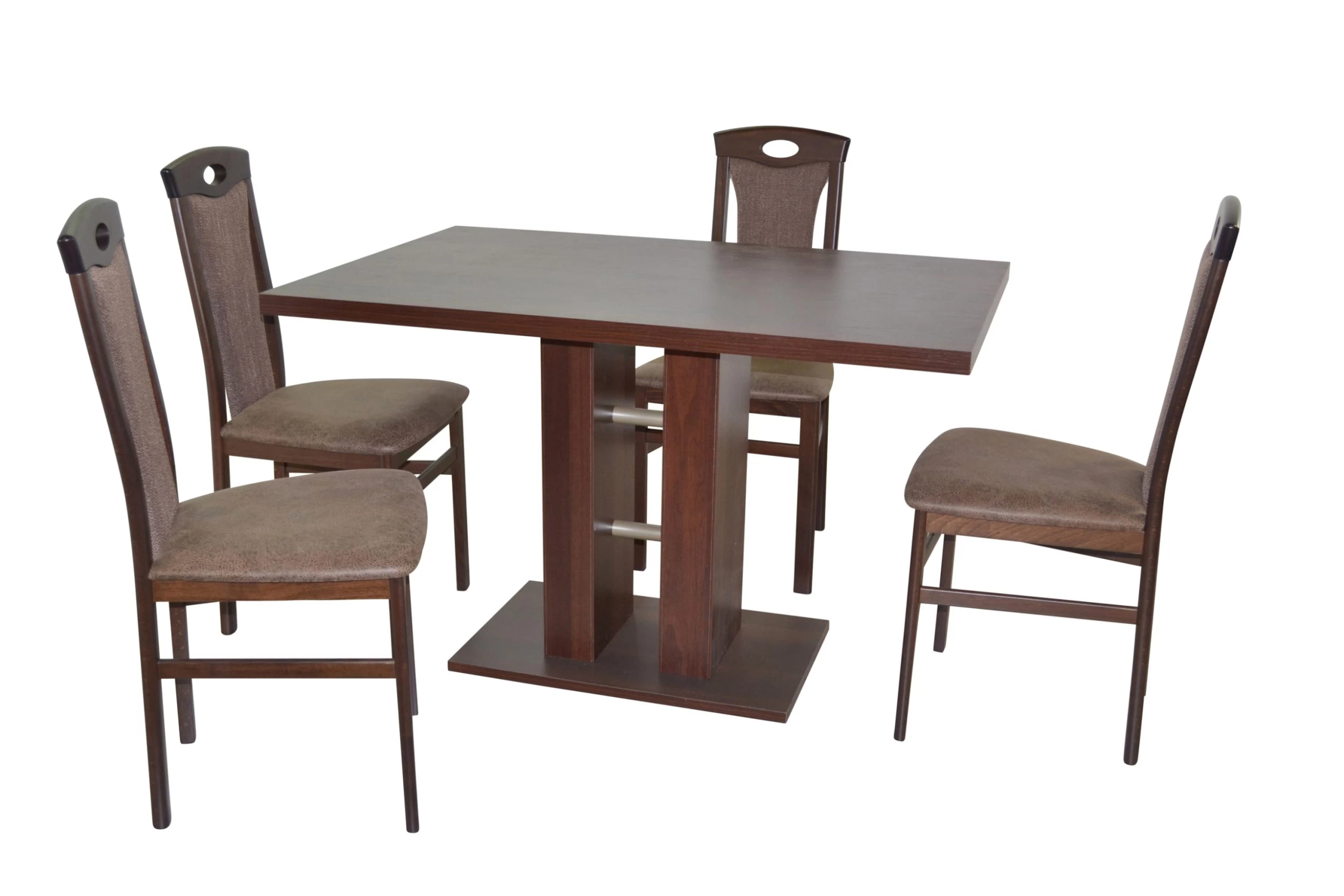 Hochwertige 5tlg. Essgruppe bestehend aus 4 Massivholzstühlen und 1 Esstisch. Stühle aus Massivholz Buche, nussbaumfarben gebeizt und lackiert. Sitz und Rücken sind bequem schaumstoffgepolstert und mit attraktiven Stoffbezügen bezogen. Sitz mit einem Bezug in Kunstlederoptik (100% Polyester), Rücken mit einem Strukturstoffbezug (90% Polyester/10% Rayon). Praktisch die eingearbeitete Griffmuschel im oberen Rückenbereich. Esstisch mit einem modernen Säulengestell komplett aus Holzwerkstoff gefertigt und mit einem strapazierfähigen, pflegeleichten Melamin-Holzdekor, Nussbaum-Nachbildung, beschichtet. Zusätzlich 2 silberfarbene Rohre im Säulengestell kombiniert. Die Stühle werden montiert angeliefert, der Esstisch flach verpackt zur Selbstmontage, inklusive Aufbauanleitung. Maße ca. cm je Stuhl: (B/H/T) 45/95/48. Sitzhöhe ca. 46 cm, Sitztiefe ca. 39 cm. Maße ca. cm Esstisch: (B/H/T) 120/75/80