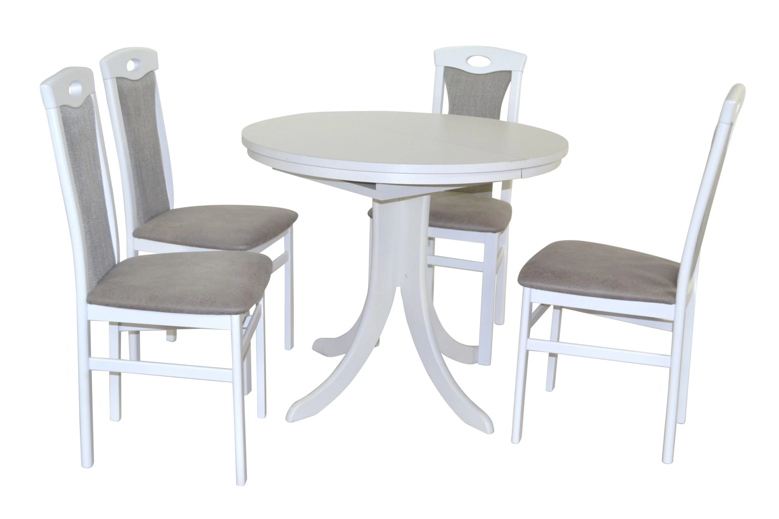 Hochwertige 5tlg. Essgruppe bestehend aus 4 Massivholzstühlen und 1 Esstisch mit zwei Ansteckplatten zum Vergrößern. Stühle aus Massivholz Buche, weiß lackiert. Sitz und Rücken sind bequem schaumstoffgepolstert und mit attraktiven Stoffbezügen bezogen. Sitz mit einem Bezug in Kunstlederoptik (100% Polyester), Rücken mit einem Strukturstoffbezug (90% Polyester/10% Rayon). Praktisch die eingearbeitete Griffmuschel im oberen Rückenbereich. Esstisch mit einer runden Tischplatte die ausziehbar ist, darunter eingelegt ist eine Einlegeplatte ca. 35 cm breit, dadurch lässt sich die Tischplatte einfach und schnell von 90 cm bis auf 125 cm vergrößern. Gestell vom Esstisch aus Massivholz Buche, weiß lackiert. Platten aus Holzwerkstoff die mit einem pflegeleichten Melamin-Holzdekor, weiß, beschichtet sind. Die Stühle werden montiert angeliefert, der Esstisch flach verpackt zur Selbstmontage, inklusive Aufbauanleitung. Maße ca. cm je Stuhl: (B/H/T) 45/95/48. Sitzhöhe ca. 46 cm, Sitztiefe ca. 39 cm. Maße ca. cm Esstisch: (B/H/T) 90-125/75/90.