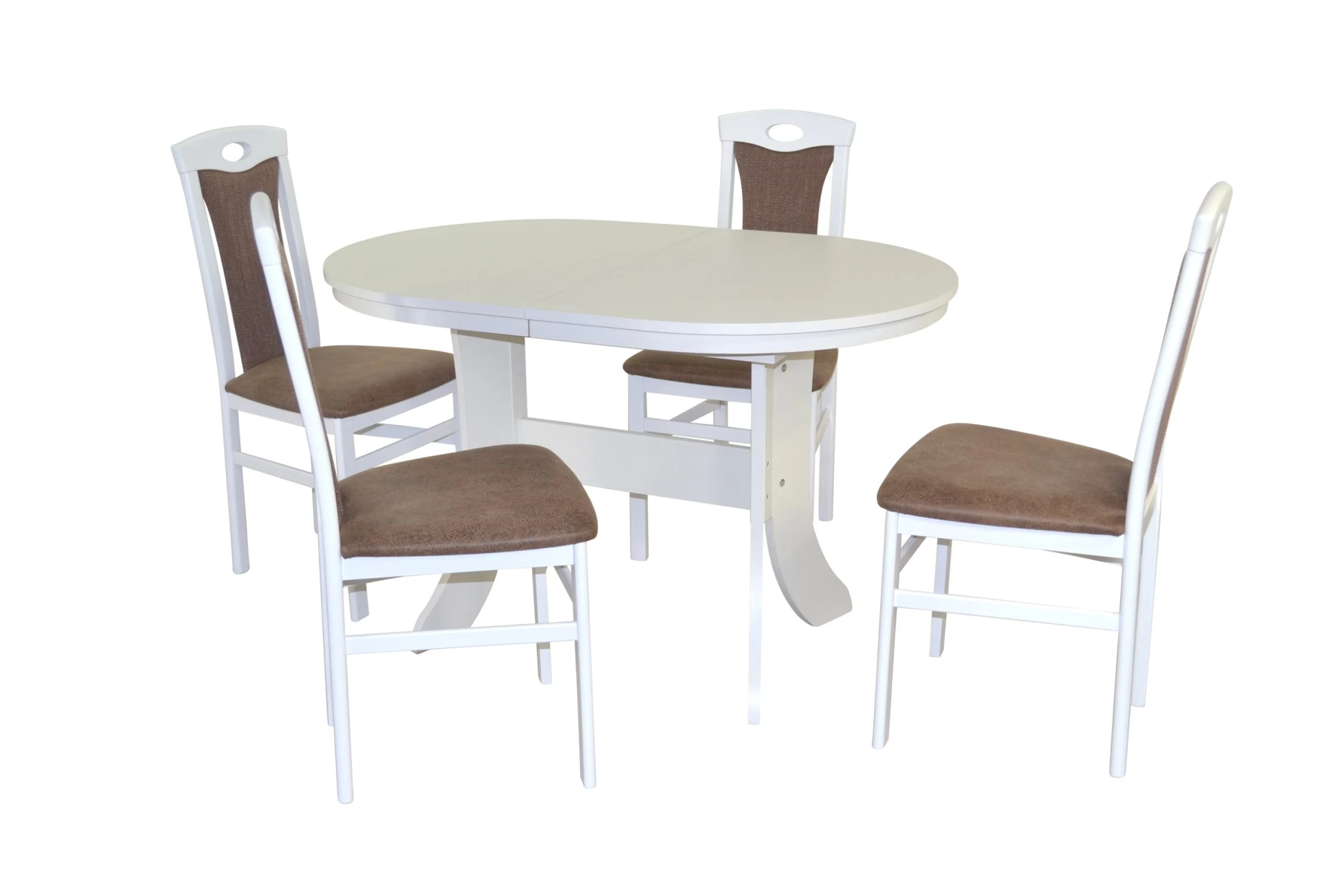Hochwertige 5tlg. Essgruppe bestehend aus 4 Massivholzstühlen und 1 Esstisch. Stühle aus Massivholz Buche, weiß lackiert. Sitz und Rücken sind bequem schaumstoffgepolstert und mit attraktiven Stoffbezügen bezogen. Sitz mit einem Bezug in Kunstlederoptik (100% Polyester), Rücken mit einem Strukturstoffbezug (90% Polyester/10% Rayon). Praktisch die eingearbeitete Griffmuschel im oberen Rückenbereich. Esstisch mit einem modernen, stabilen Gestell komplett aus Holzwerkstoff gefertigt und mit einem strapazierfähigen, pflegeleichten Melamin-Holzdekor, weiß, beschichtet. Die ovale Tischplatte ist ausziehbar, darunter ist eine ca. 40 cm breite Einlegeplatte, die sich problemlos dazwischen einlegen lässt und der Tisch schnell und einfach von 120 cm bis auf 160 cm vergrößerbar ist. Die Stühle werden montiert angeliefert, der Esstisch flach verpackt zur Selbstmontage, inklusive Aufbauanleitung. Maße ca. cm je Stuhl: (B/H/T) 45/95/48. Sitzhöhe ca. 46 cm, Sitztiefe ca. 39 cm. Maße ca. cm Esstisch: (BxHxT) 120-160x75x80.