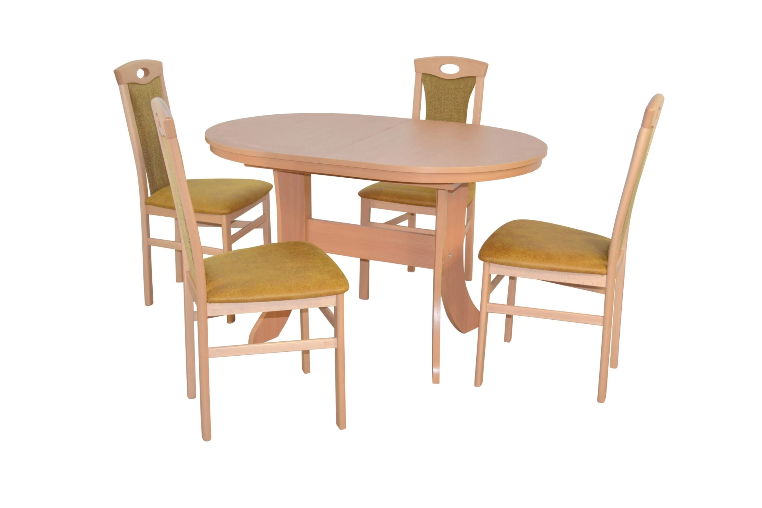 Hochwertige 5tlg. Essgruppe bestehend aus 4 Massivholzstühlen und 1 Esstisch. Stühle aus Massivholz Buche, buchefarben gebeizt und lackiert. Sitz und Rücken sind bequem schaumstoffgepolstert und mit attraktiven Stoffbezügen bezogen. Sitz mit einem Bezug in Kunstlederoptik (100% Polyester), Rücken mit einem Strukturstoffbezug (90% Polyester/10% Rayon). Praktisch die eingearbeitete Griffmuschel im oberen Rückenbereich. Esstisch mit einem modernen, stabilen Gestell komplett aus Holzwerkstoff gefertigt und mit einem strapazierfähigen, pflegeleichten Melamin-Holzdekor, Buche-Nachbildung, beschichtet. Die ovale Tischplatte ist ausziehbar, darunter ist eine ca. 40 cm breite Einlegeplatte, die sich problemlos dazwischen einlegen lässt und der Tisch schnell und einfach von 120 cm bis auf 160 cm vergrößerbar ist. Die Stühle werden montiert angeliefert, der Esstisch flach verpackt zur Selbstmontage, inklusive Aufbauanleitung. Maße ca. cm je Stuhl: (B/H/T) 45/95/48. Sitzhöhe ca. 46 cm, Sitztiefe ca. 39 cm. Maße ca. cm Esstisch: (BxHxT) 120-160x75x80.