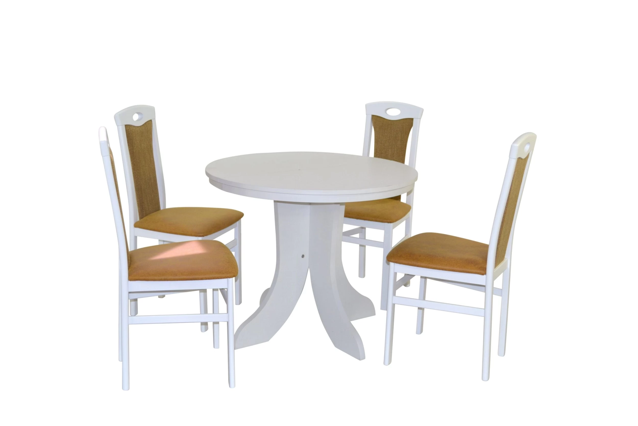 Hochwertige 5tlg. Essgruppe bestehend aus 4 Massivholzstühlen und 1 Esstisch. Stühle aus Massivholz Buche, weiß lackiert. Sitz und Rücken sind bequem schaumstoffgepolstert und mit attraktiven Stoffbezügen bezogen. Sitz mit einem Bezug in Kunstlederoptik (100% Polyester), Rücken mit einem Strukturstoffbezug (90% Polyester/10% Rayon). Praktisch die eingearbeitete Griffmuschel im oberen Rückenbereich. Esstisch mit einem modernen, stabilen Gestell komplett aus Holzwerkstoff gefertigt und mit einem strapazierfähigen, pflegeleichten Melamin-Holzdekor, weiß, beschichtet. Die runde Tischplatte ist ausziehbar und lässt sich durch die mitgelieferte ca. 40 cm breite Einlegeplatte von 90 cm auf 130 cm vergrößern. Die Stühle werden montiert angeliefert, der Esstisch flach verpackt zur Selbstmontage, inklusive Aufbauanleitung. Maße ca. cm je Stuhl: (B/H/T) 45/95/48. Sitzhöhe ca. 46 cm, Sitztiefe ca. 39 cm. Maße ca. cm Esstisch: (ØxH) 90×75 cm bis auf 130 cm Breite vergrößerbar. Einlegeplatte lässt sich nicht unter der Tischplatte verstauen.
