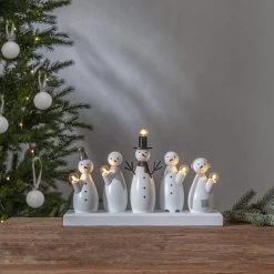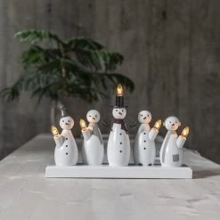 Fensterleuchter Schneemänner – 5flammig – warmweiße E10 Glühlampen – H: 21cm, L: 33cm – weiß Dieser liebevoll gestaltete Holzleuchter zeigt 5 Schneefiguren als Famile in winterlicher Szene. Die 5 weißen Schneemänner, die hier Spalier stehen, tragen jeweils eine warmweiß leuchtende Glühlampe in Kerzenform.