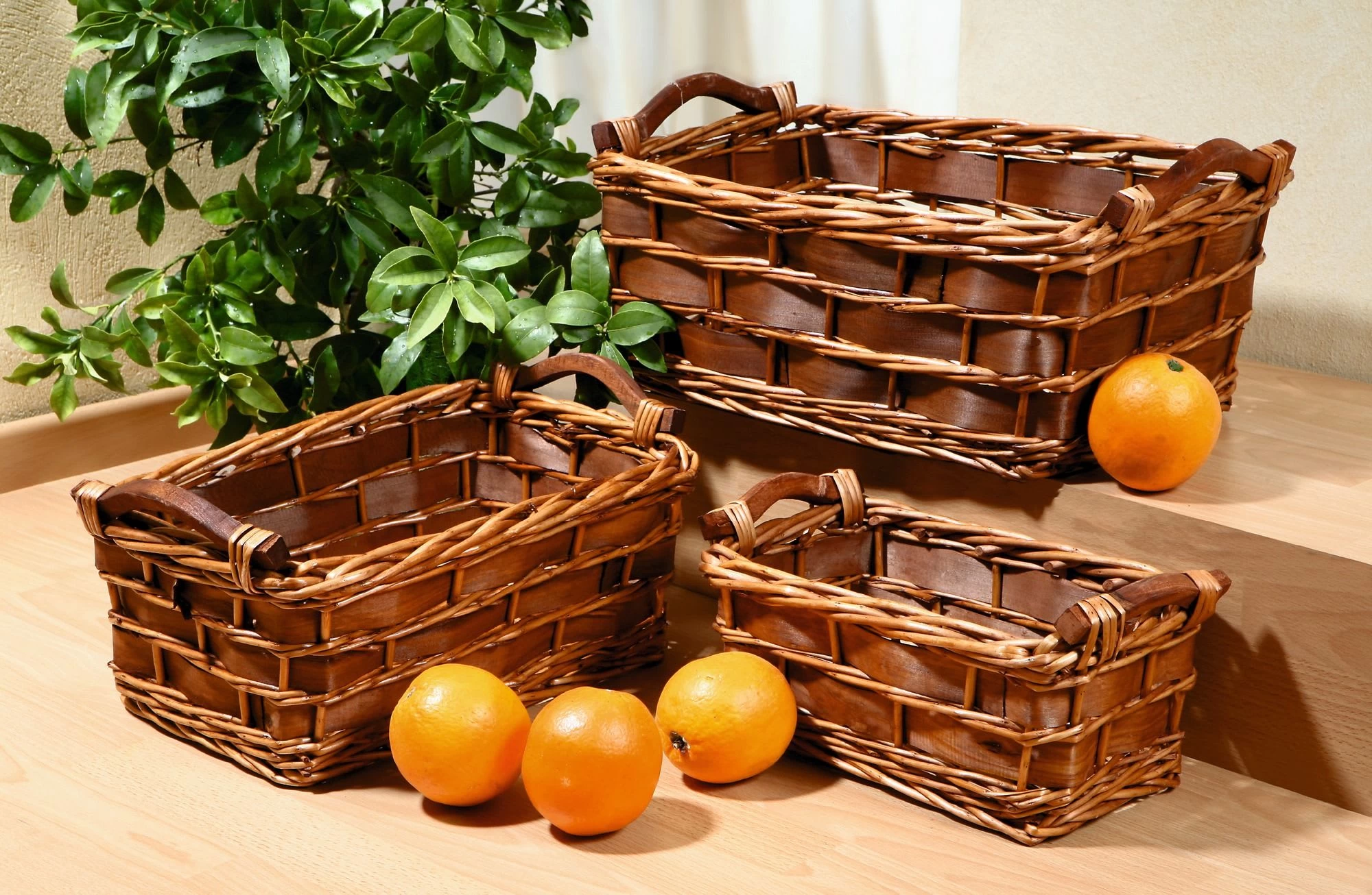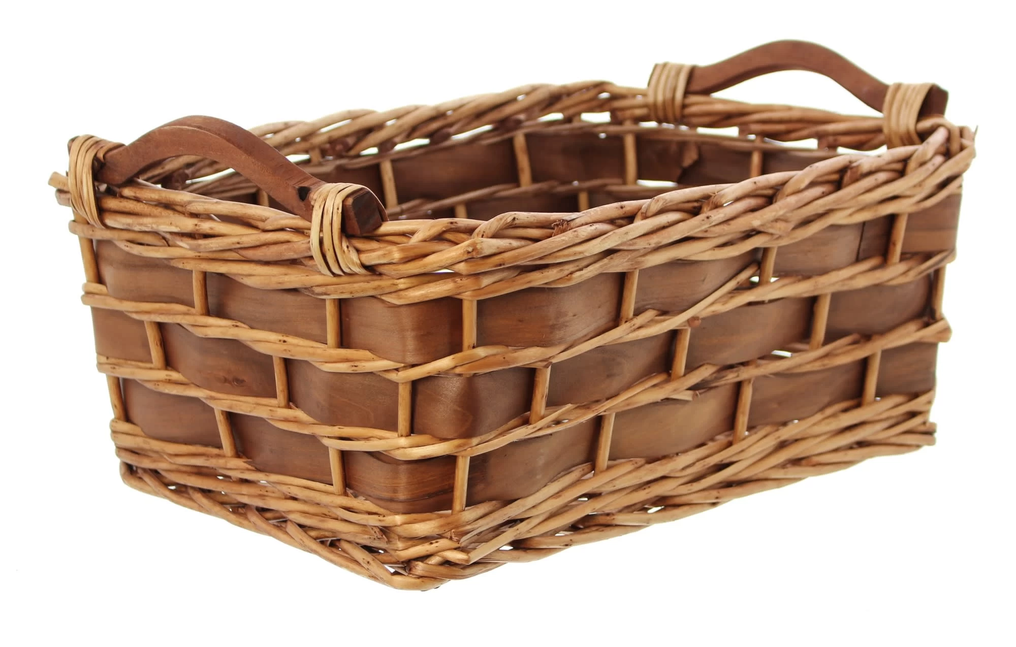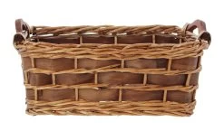 natur lackierte Vollweide aufwändig mit braunem Holzspan verflochten, braune Holzgriffe