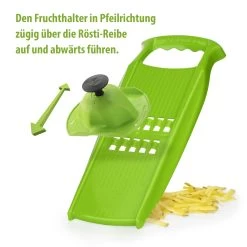 In Kombination mit dem mitgelieferten Fruchthalter koennen Sie ruckizucki sowohl rohes als auch gegartes Gemuese zu Roesti-Schnetzel verarbeiten.