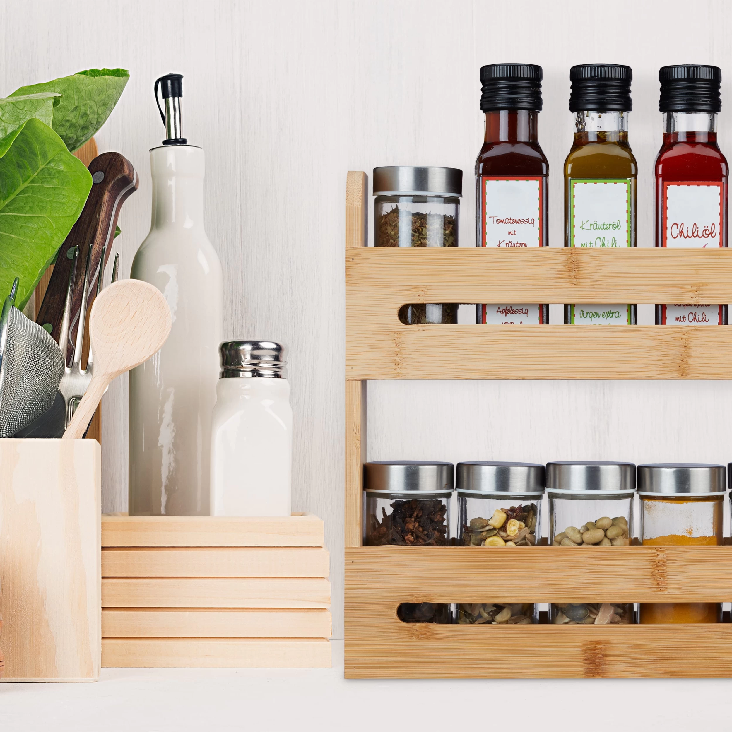 Dieses Gewürzregal sorgt für Ordnung und Übersicht in Deiner Küche. Auf den 2 Etagen des Küchenregals kannst Du Deine Gewürze, kleine Ölflaschen, Teebeutel und weitere Küchenutensilien griffbereit aufbewahren. Platziere den Gewürz-Organizer zum Hinstellen einfach auf der Arbeitsplatte. So hast Du Deine Gewürze immer gut im Blick, während auf der Küchenzeile noch ausreichend Platz zum Arbeiten ist. Die Fertigung aus natürlichem Bambus lässt die Gewürzablage zudem für eine warme Optik sorgen.