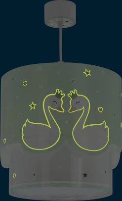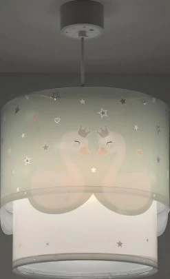 Ein niedliches Schwanenpaar prägt das Design der Deckenlampe Sweet Love von Dalber. Das angenehme Licht schafft eine behagliche Atmosphäre. Deckenlampe Sweet Love von Dalber mit Stern-, Herz- und Schwanenpaarmotiven runder, doppelter Lampenschirm fluoreszierender Effekt abnehmbarer Lichtdiffusor höhenverstellbar aus Polypropylen Die Deckenlampe aus der Kollektion Sweet Love besticht mit einem niedlichen Design. Ein Schwanenpaar, Herzen, Kronen und Sterne ermuntern Deinen Mini zum Anschauen. Die Lampe ist mit einem doppelten Lampenschirm aus transparentem Polypropylen ausgestattet. Ihr Licht wirkt warm und entspannend. Sie ist höhenverstellbar, damit sie sich perfekt an die Raumhöhe anpassen lässt. Die Leuchte verfügt über einen abnehmbaren unteren Lichtdiffusor. So wird Dein Kind nicht geblendet. Der Clou nach dem Ausschalten: Der Fluoreszenzeffekt lässt die Umrisse der Schwäne und Sterne noch einige Minuten nachleuchten. Das Einschlummern gelingt dann viel besser. Hinweis Das passende Leuchtmittel (E27, 15W LED) ist nicht im Lieferumfang enthalten.