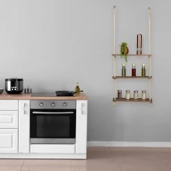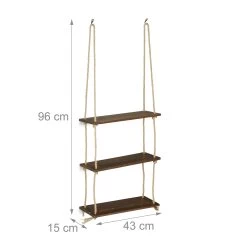 Ob Blumentopf oder Deko – das Schweberegal mit 3 Ablagen schafft schnell Platz und bieten Ihnen eine variable Stellfläche. Ideal für Pflanzen, Bilderrahmen oder Gewürze. Sie befestigen die mitgelieferten Haken mit den beiliegenden Schrauben an der Wand oder einem Balken. Dabei kommt es bei diesem Seilregal nicht auf den Millimeter an, denn Sie hängen die Seile ein und können die Knoten unterm Holzbrett bei Bedarf versetzen. Ob im Landhaus oder als Retro-Blickfang – das Regal passt sich ein.
