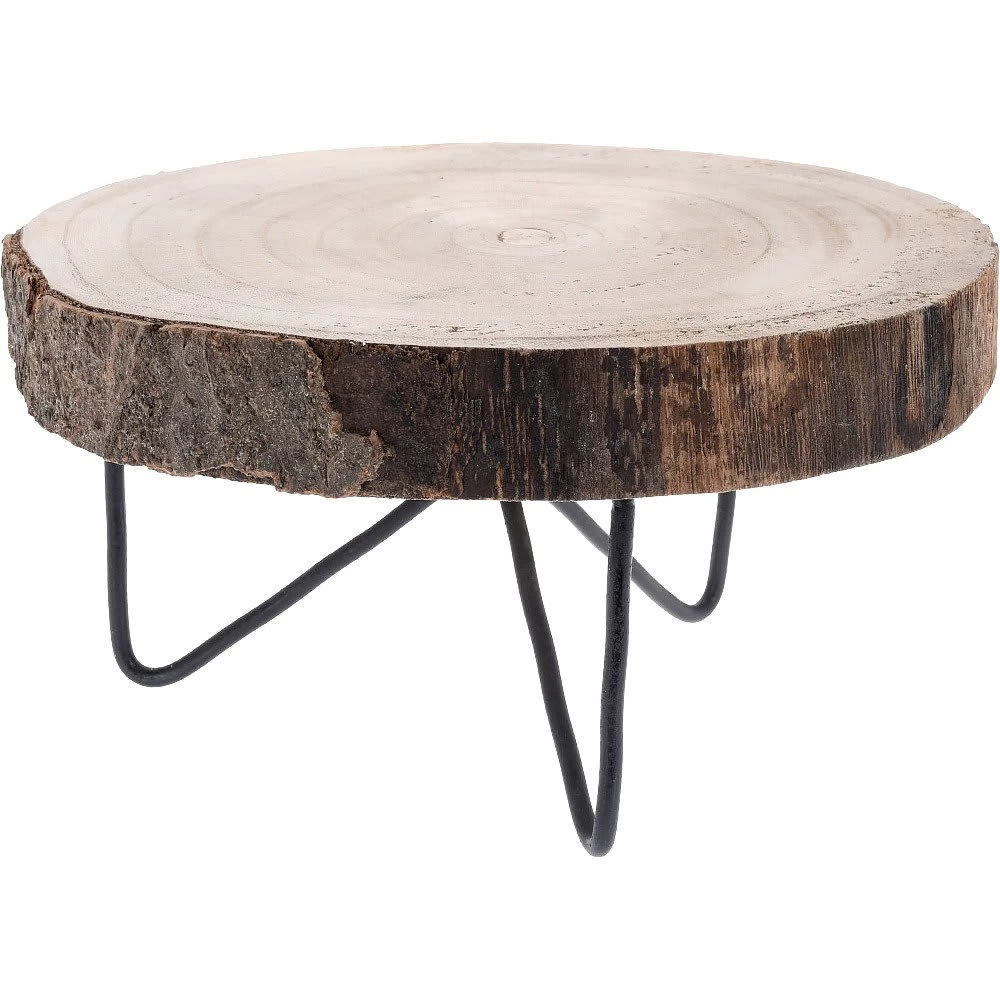 Holztablett auf Beinen, Holzscheibe, Ø 24 cm ist ein Accessoire mit einem einzigartigen Design. Es lenkt die Aufmerksamkeit auf seine ursprüngliche Konstruktion, und die Kombination von Holz und Metall fügt sich in die neuesten Trends des Gebrauchsmusters ein. Dank seines Designs und seines minimalistischen Charakters wird es sicherlich ein Produkt sein, das dem Interieur einen originellen Charakter verleiht.