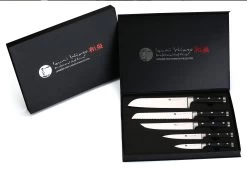 So beinhaltet das Set neben dem klassischen japanischen Gemüsemesser, dem großen Fisch-, Fleisch, und Gemüsemesser (Santoku), einem Schälmesser (Petty) auch ein Filetiermesser. Zudem liegt diesem Set ein Brotmesser bei, bei welchem die Klinge, wie in Japan üblich, beidseitig geschliffen ist. Dies erlaubt auch bei harten Brotstücken einen geraden Schnitt durch das Brot.
