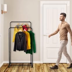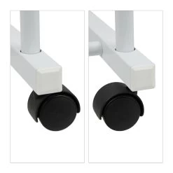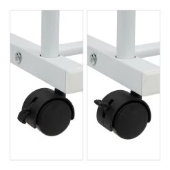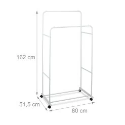Die rollbare Kleidergarderobe mit 2 Wäschestangen schafft praktischen Stauraum im Flur oder Schlafzimmer. Jacken, Hemden, Blusen, Kleider und mehr sind mithilfe von Kleiderbügeln schnell und übersichtlich an den Garderobenstangen aufgehängt. Zwei seitliche Stopper verhindern, dass die Bügel herunter rutschen. Der Kleiderwagen ist schnell aufgebaut, kann dank seiner 4 Rollen flexibel bewegt werden und eignet sich so auch wunderbar für Deinen nächsten Stand auf dem Flohmarkt.