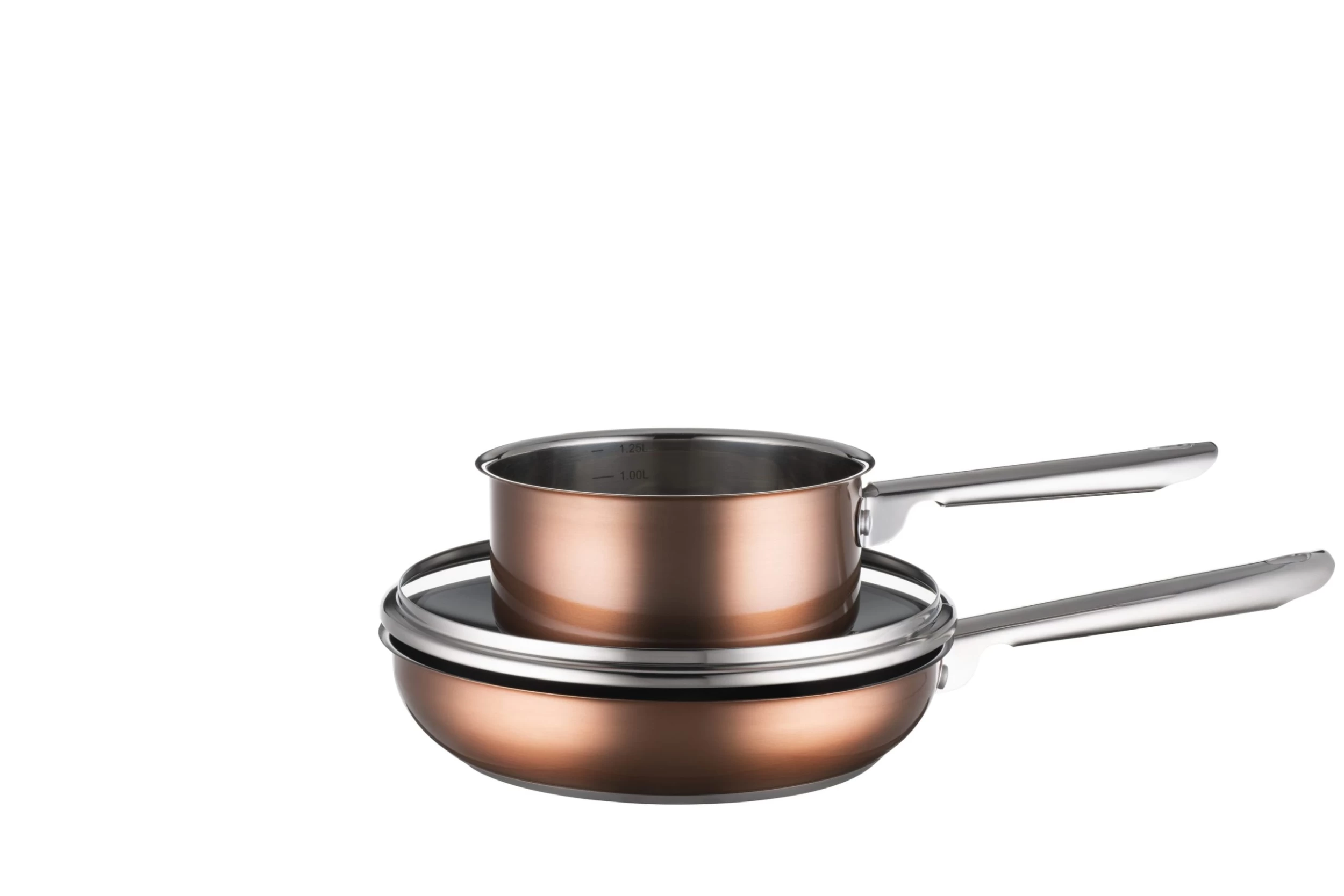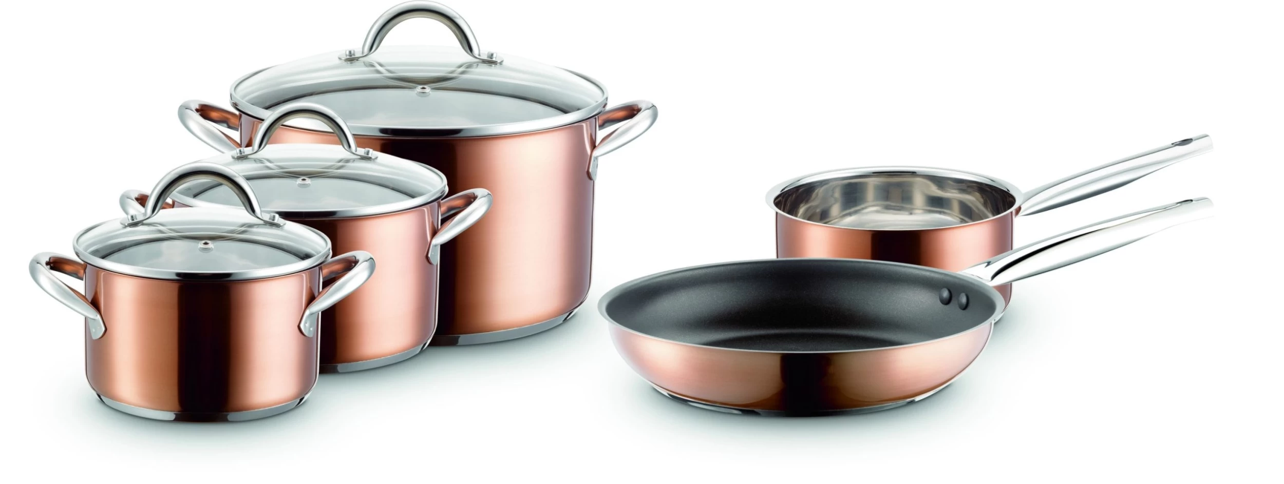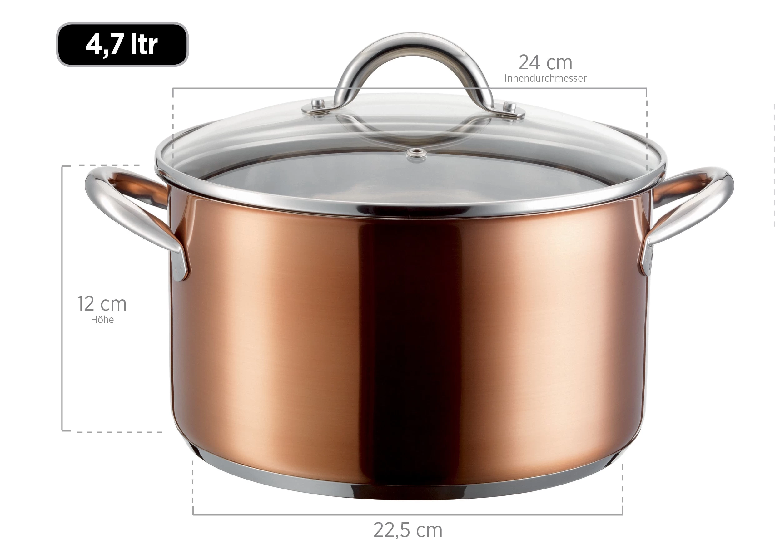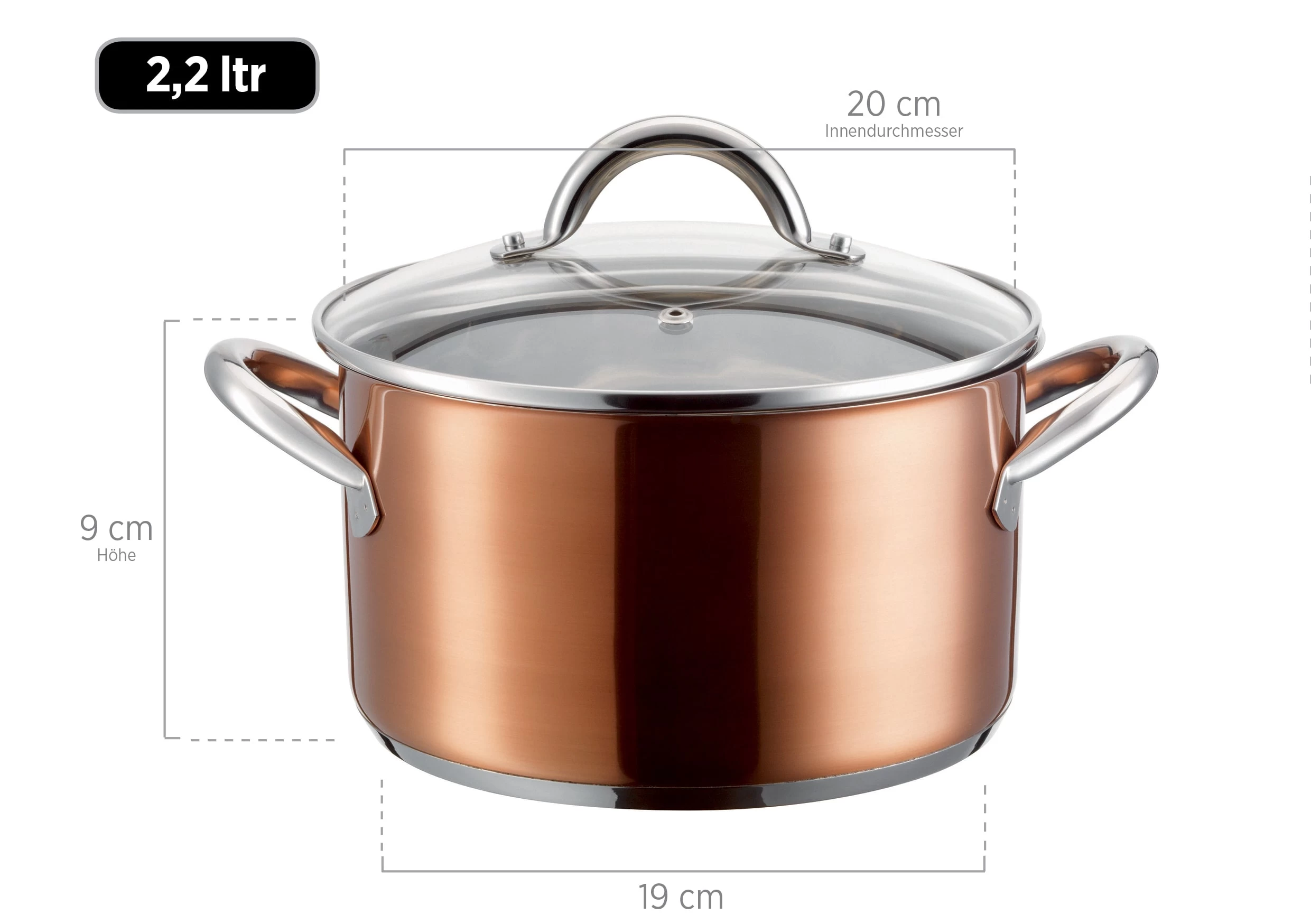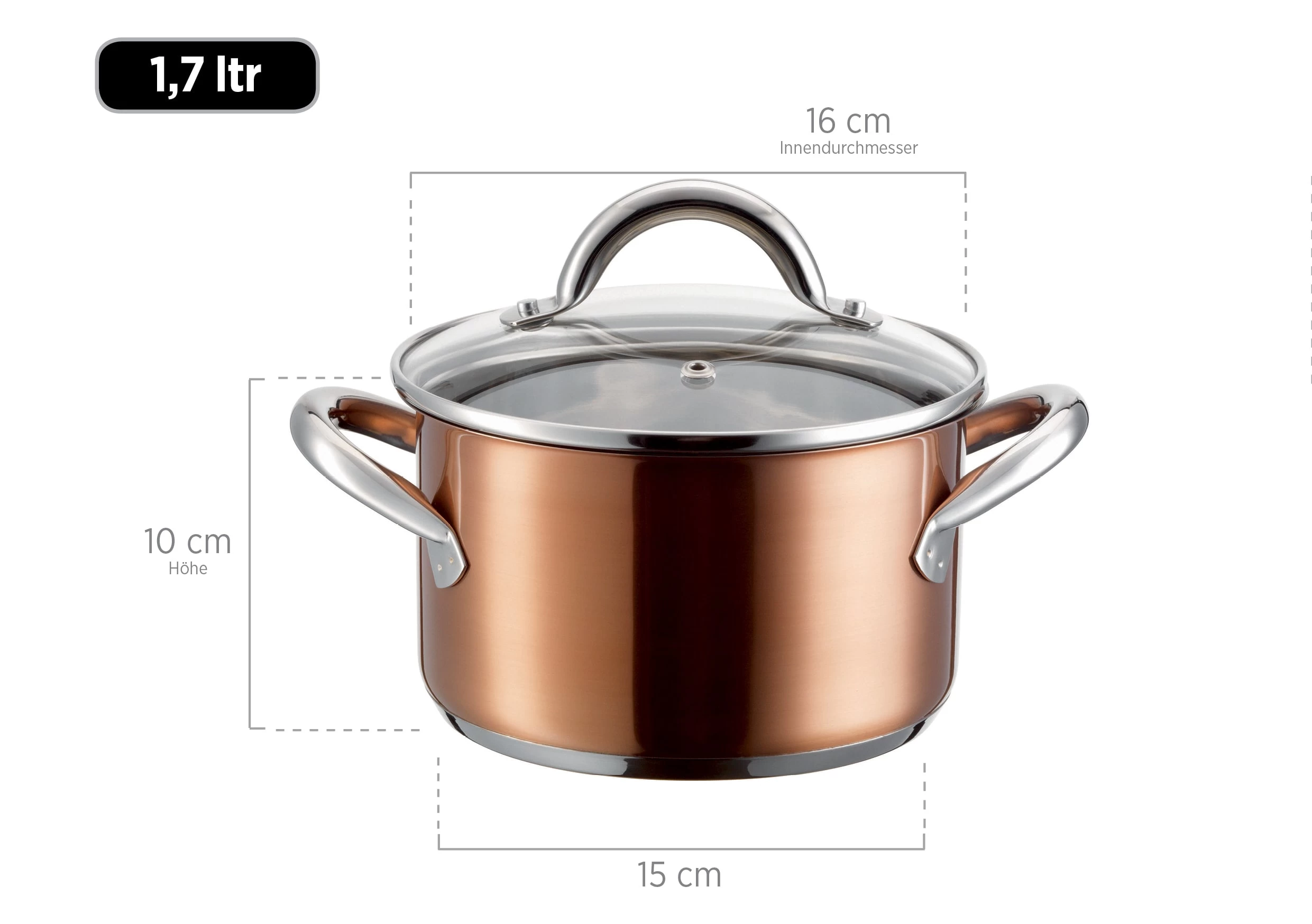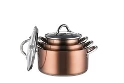 Dieses 8-teilige, induktionsgeeignete Edelstahl-Kochset der österreichischen Traditionsmarke MÄSER besteht aus 3 Fleischtöpfen mit Deckel, 1 Stielkasserolle und 1 antihaftbeschichteten Bratpfanne. Mit seinem Kupfer-Look ist dieses hochwertige Kochtopfset ein echter Hingucker in jeder Küche.