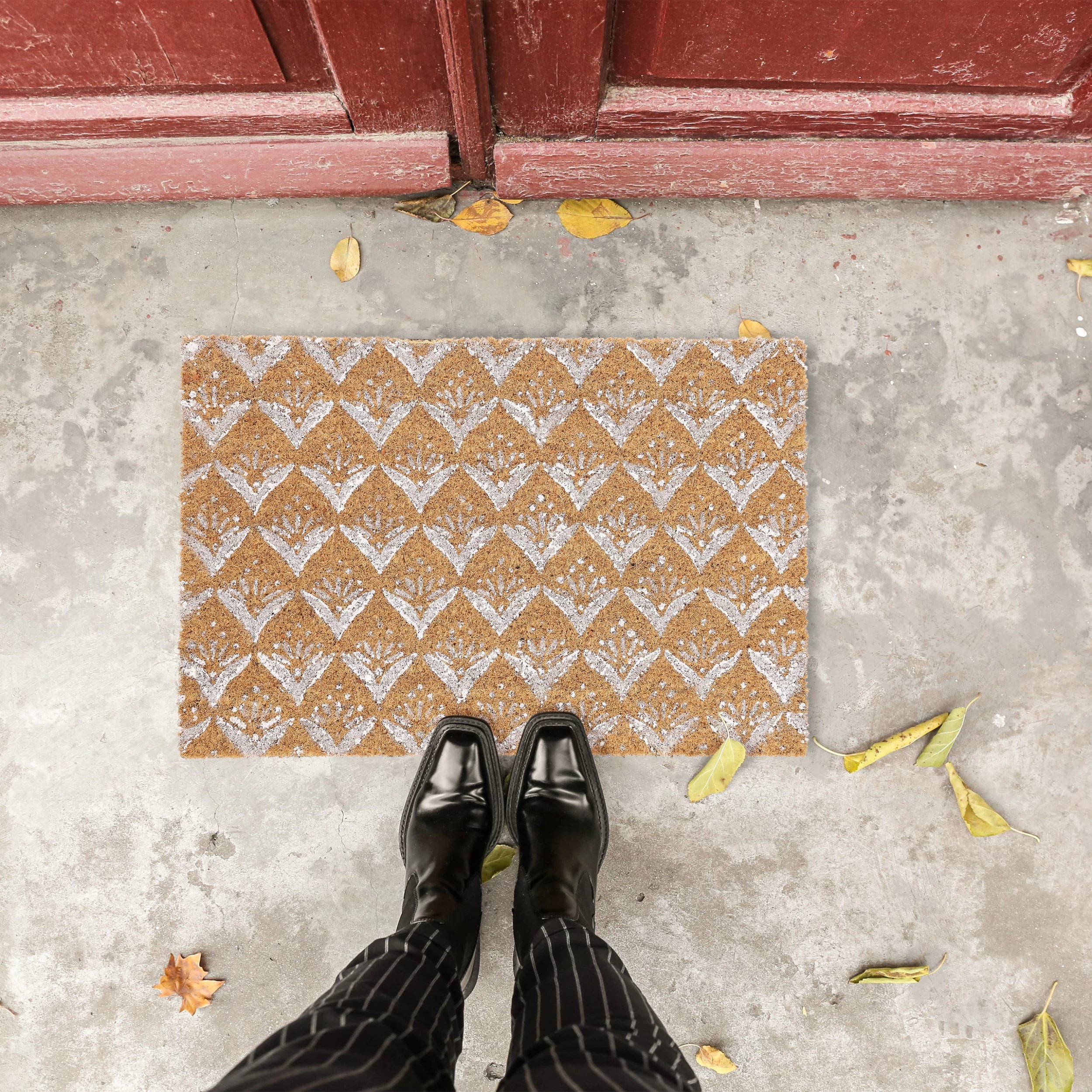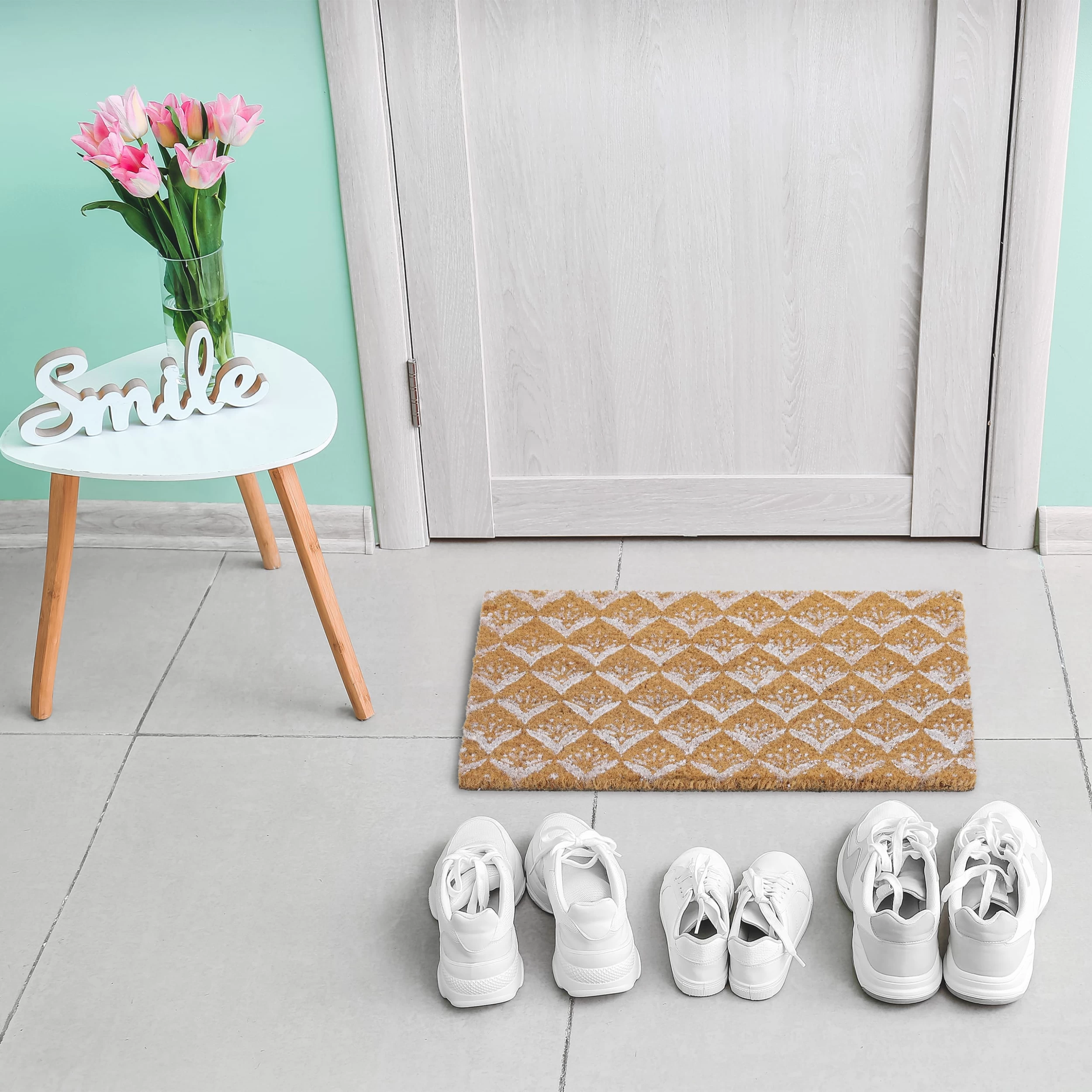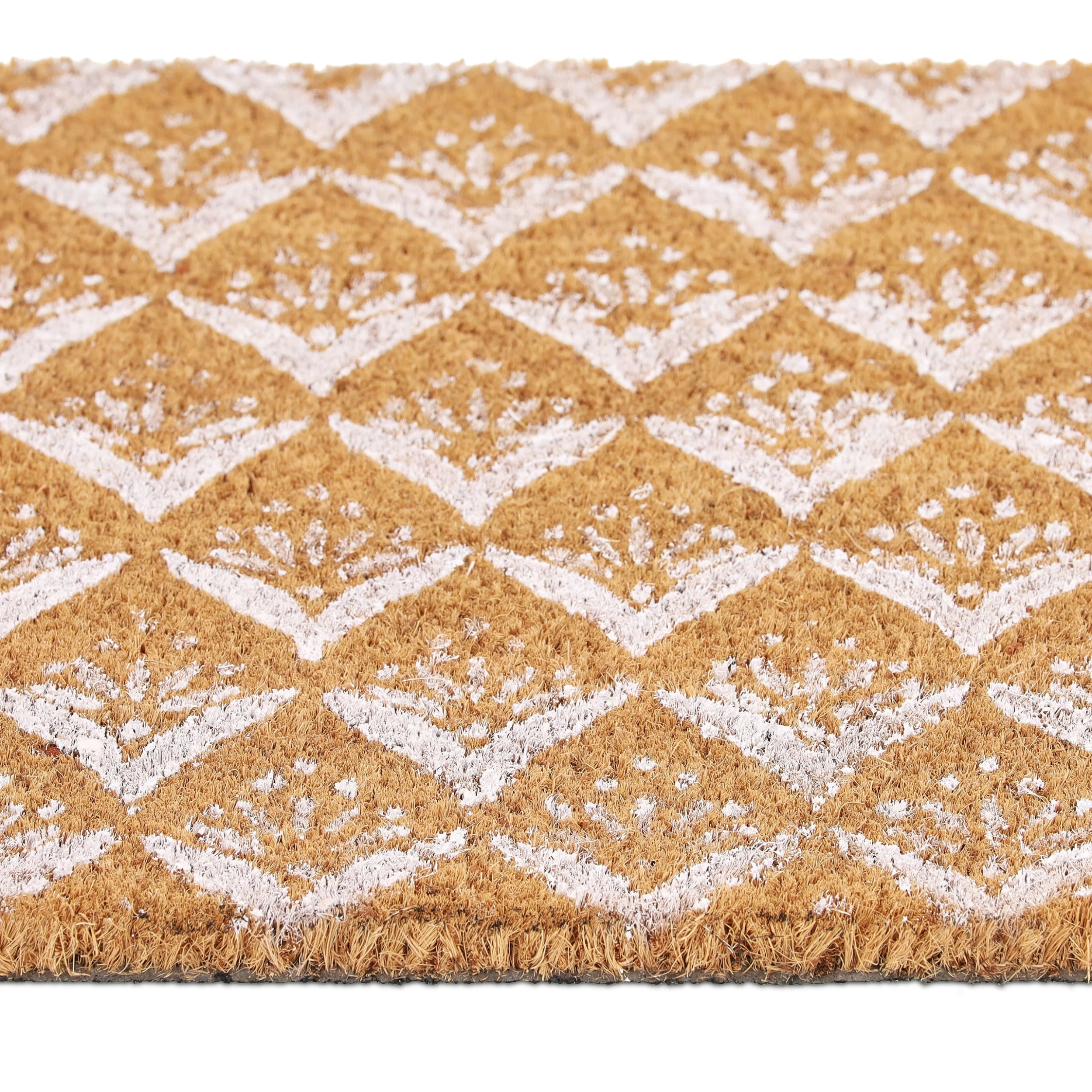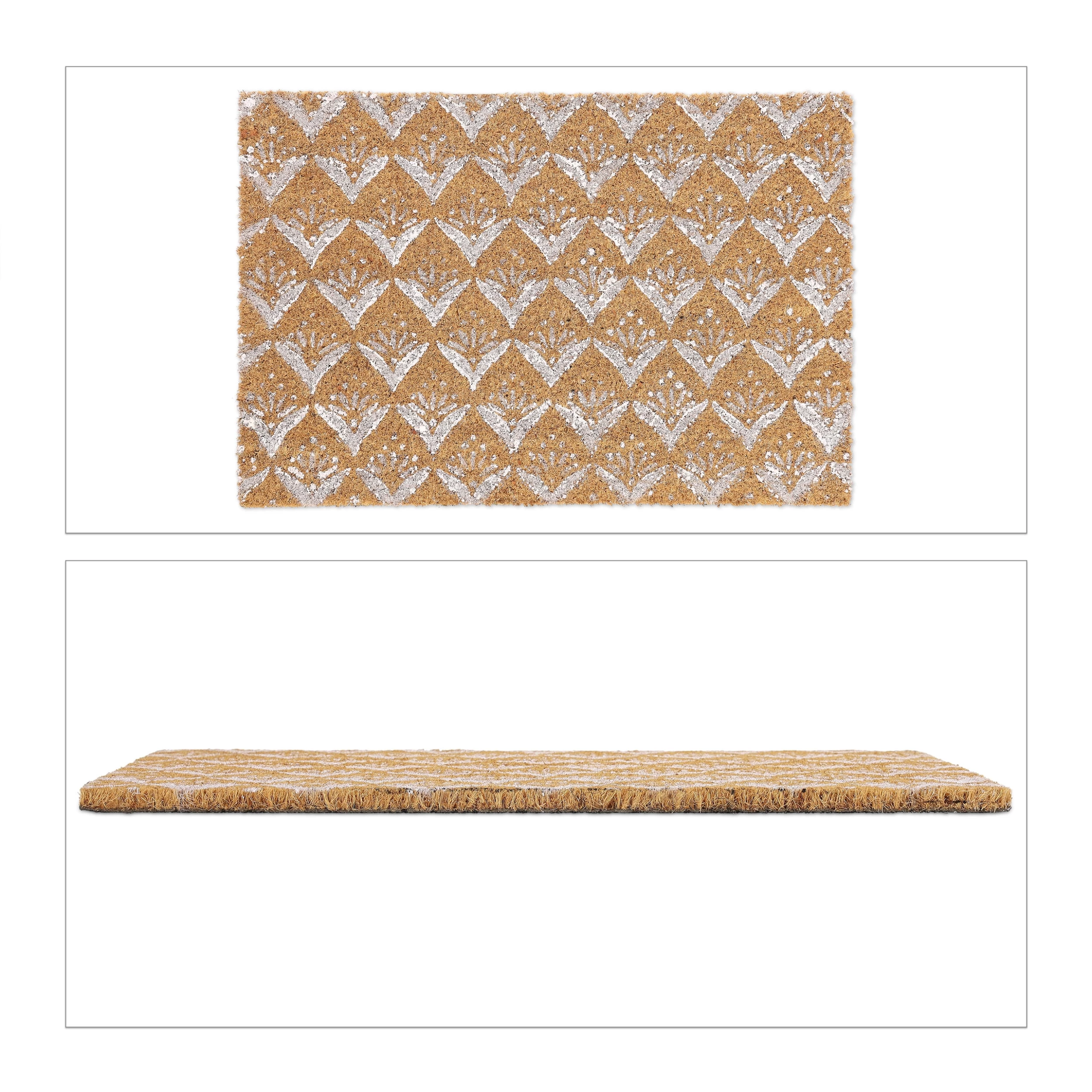 Verschönere Deinen Eingangsbereich mit dieser dekorativen Sauberlaufmatte. Das geometrische Muster der Kokos Fußmatte mitsamt weißen, floralen Ornamenten ist ein echter Hingucker. Dank Antirutsch Unterseite aus PVC haftet die Schmutzmatte beim Abtreten der Schuhe fest am Boden und hält den Wohnraum zuverlässig sauber. Aufgrund der natürlichen Kokosfasern ist die Haustürmatte zudem robust und langlebig. Der wetterfeste Schuhabtreter ist bestens für den Einsatz im Innen- und Außenbereich geeignet.