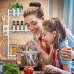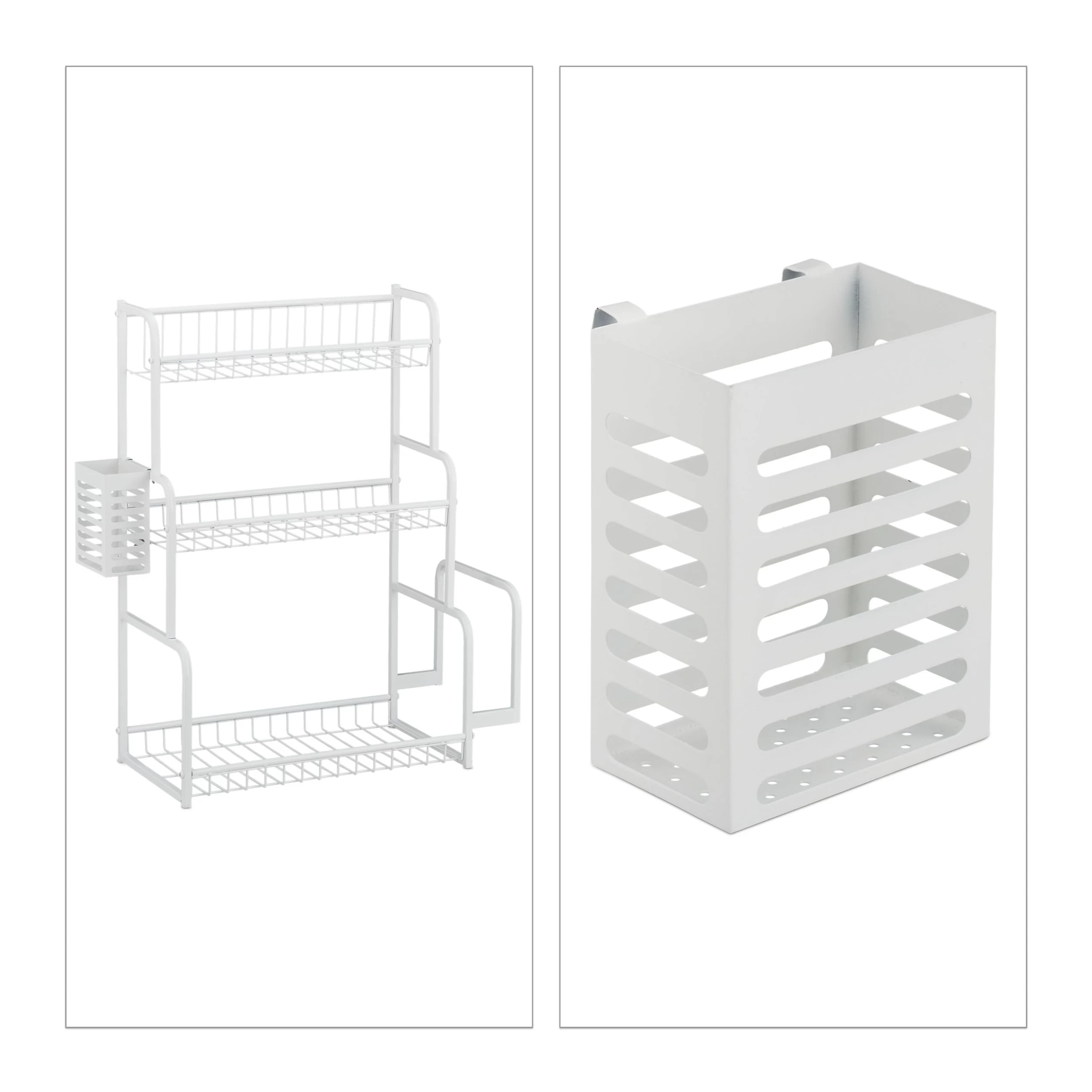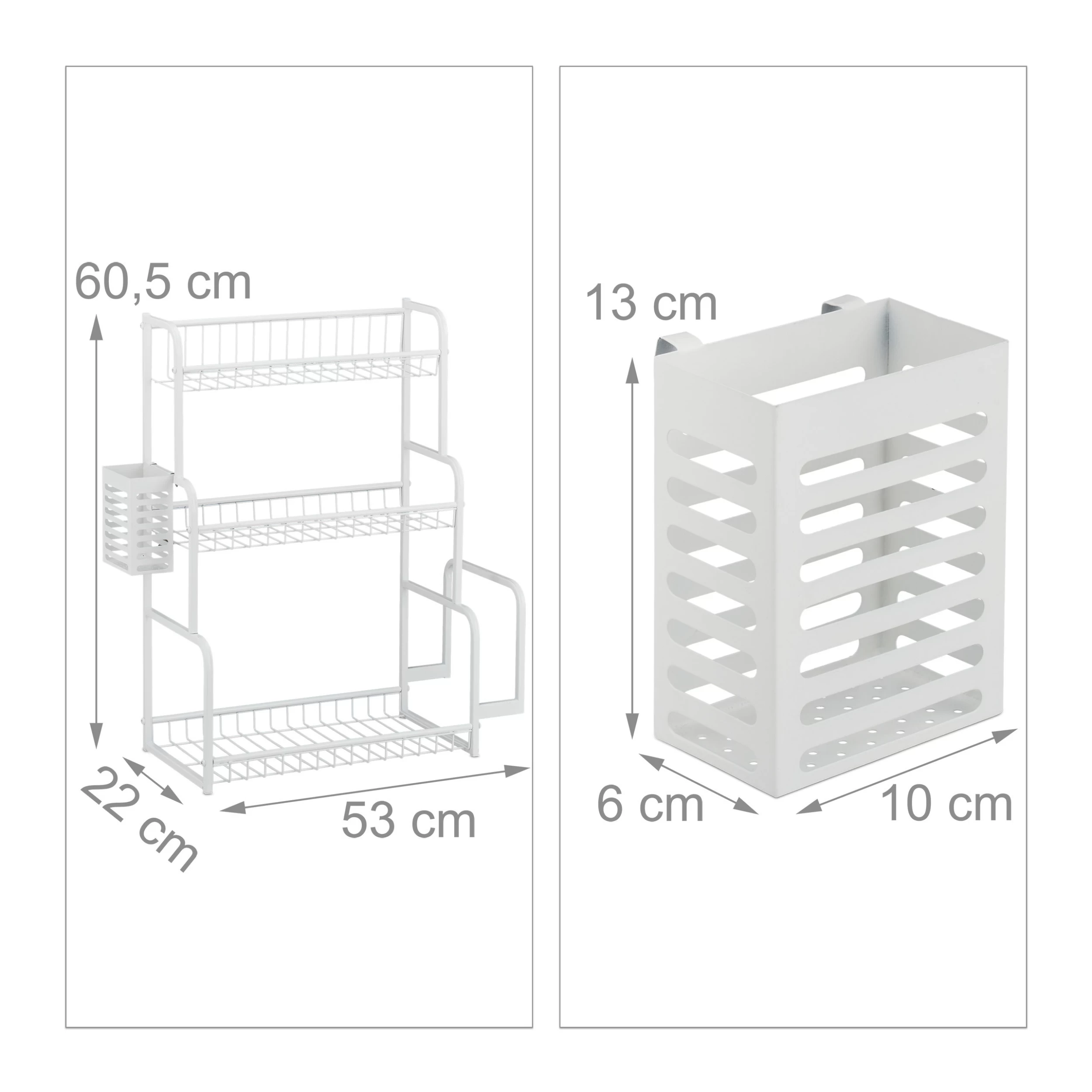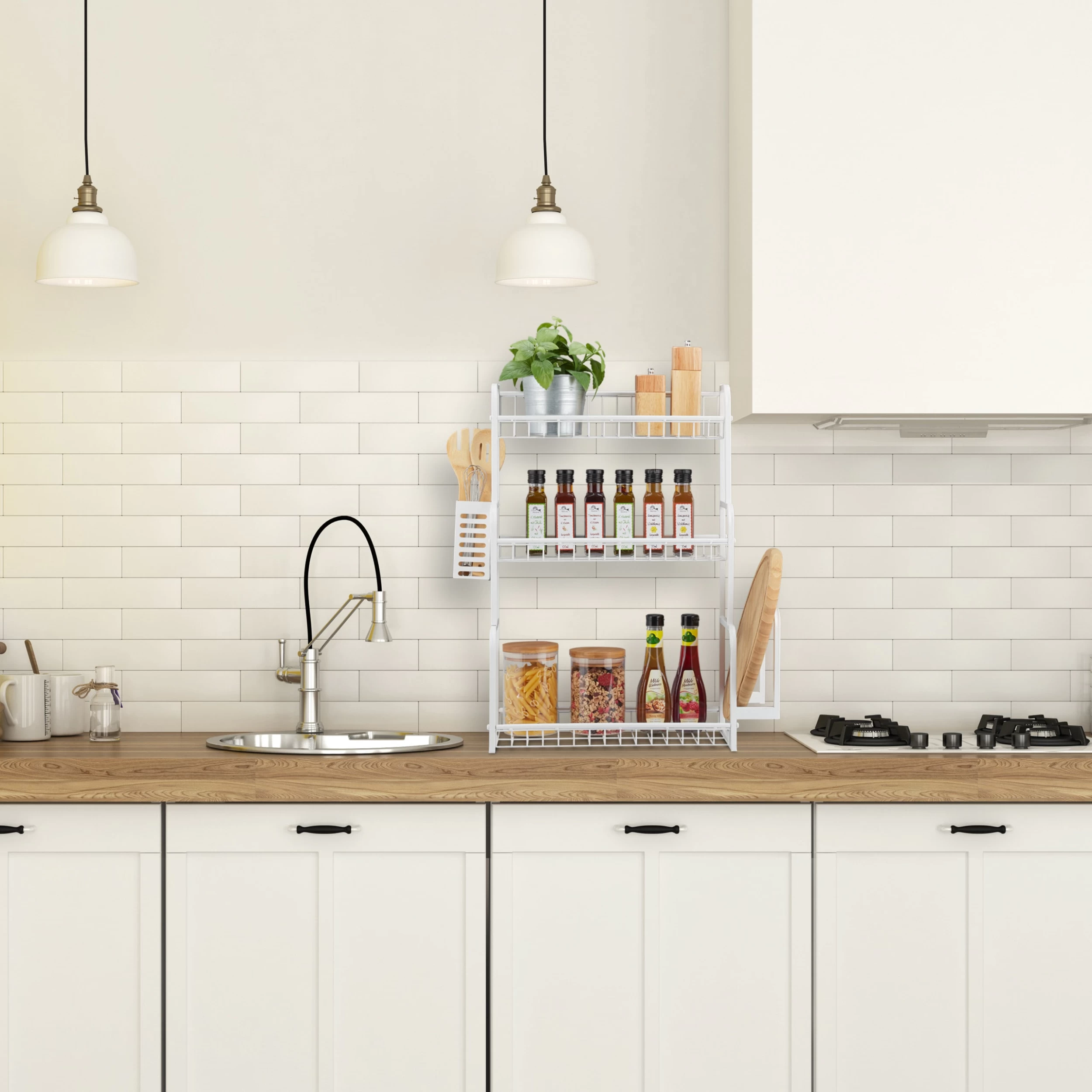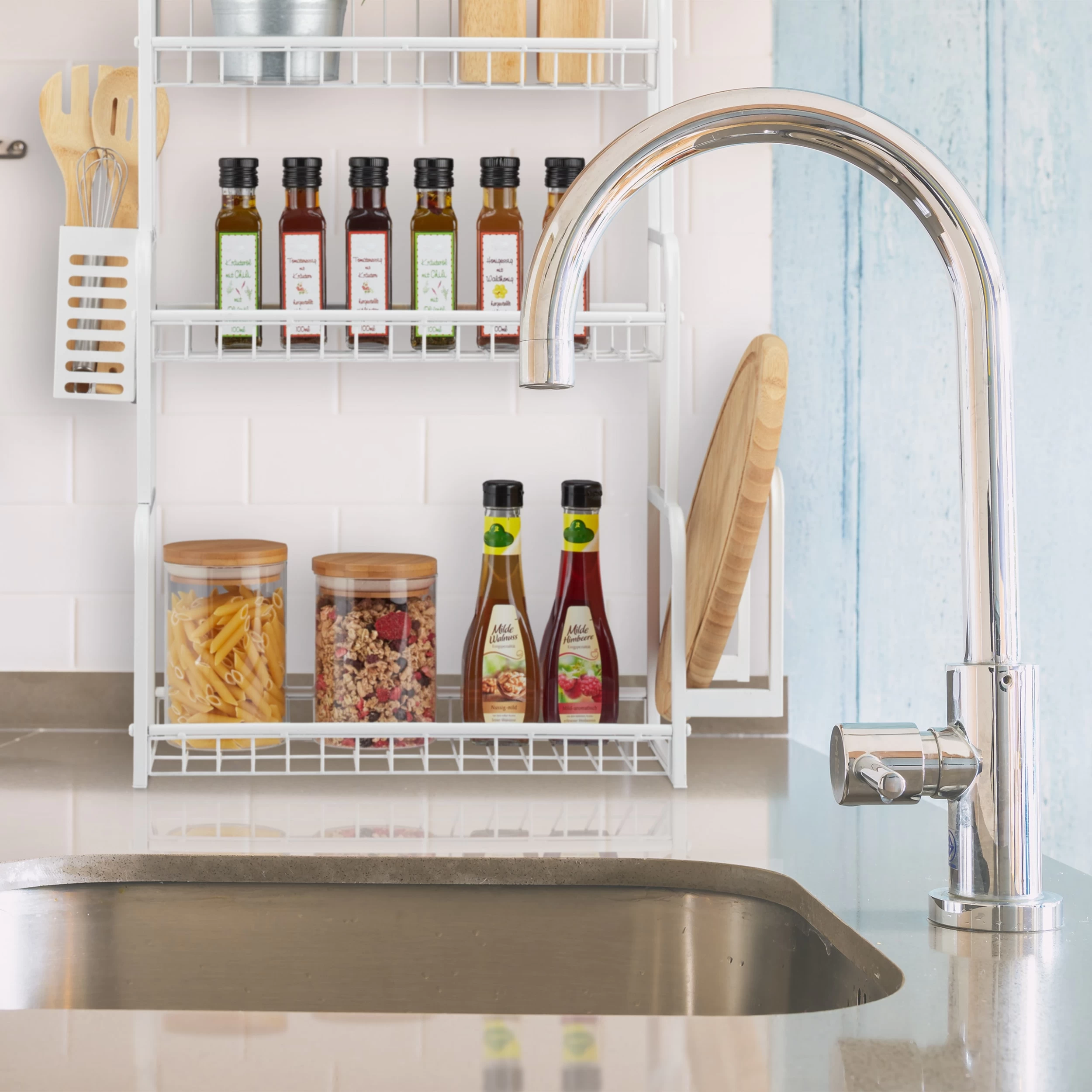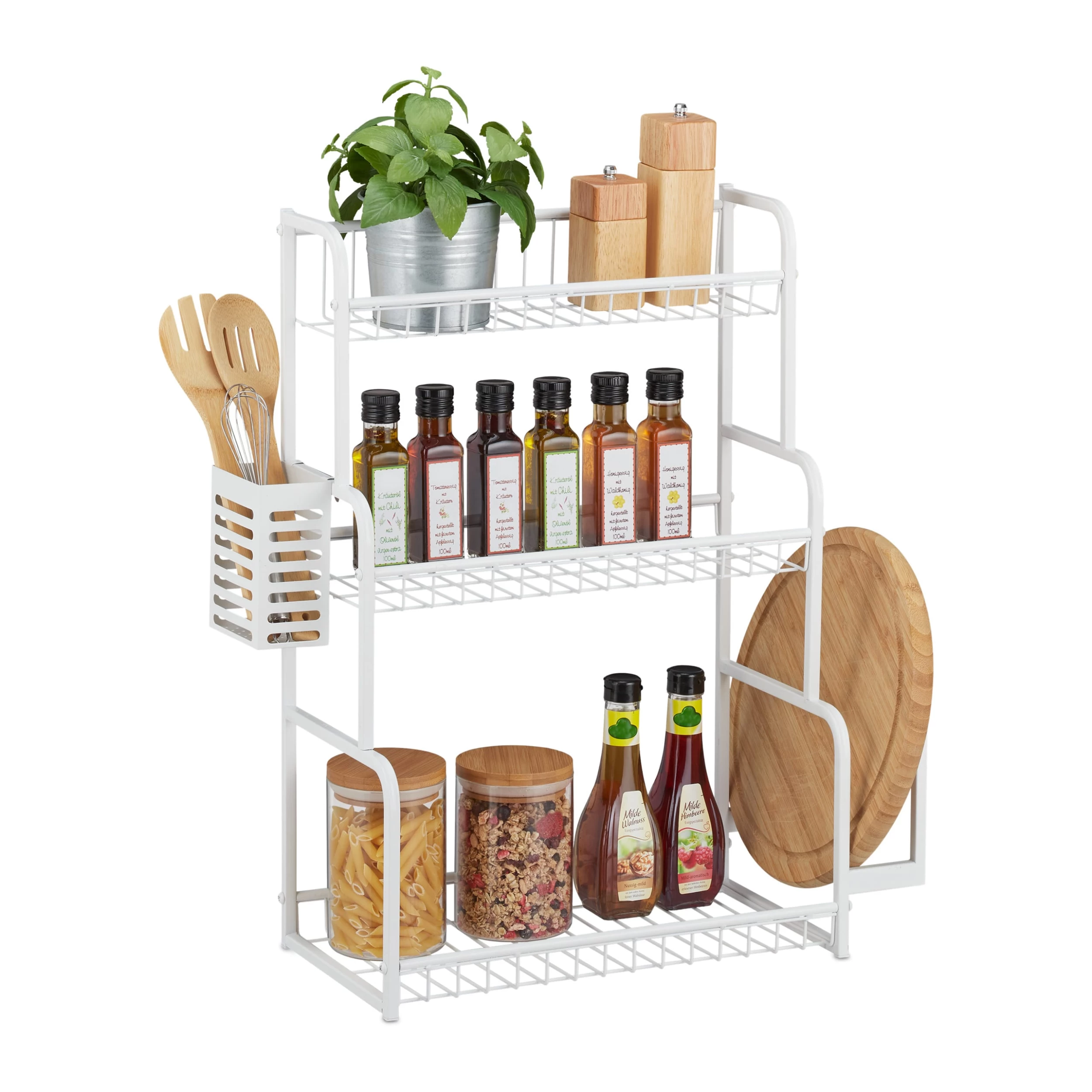 Mit dem Aufsatzregal schaffst Du wertvollen Stauraum auf der Arbeitsplatte und bringst Ordnung ins Küchenchaos. Das Ablageregal bietet auf 3 Ebenen Platz für Gewürzgläser, Vorratsdosen, Ölflaschen und mehr. Auch Schneidebrettchen und Küchenbesteck finden in dem Arbeitsflächenregal einen Platz. So hast Du beim Kochen stets alles griffbereit zur Hand. Das matt-weiße Design des Ölregals setzt dabei in jeder Küche moderne Akzente.
