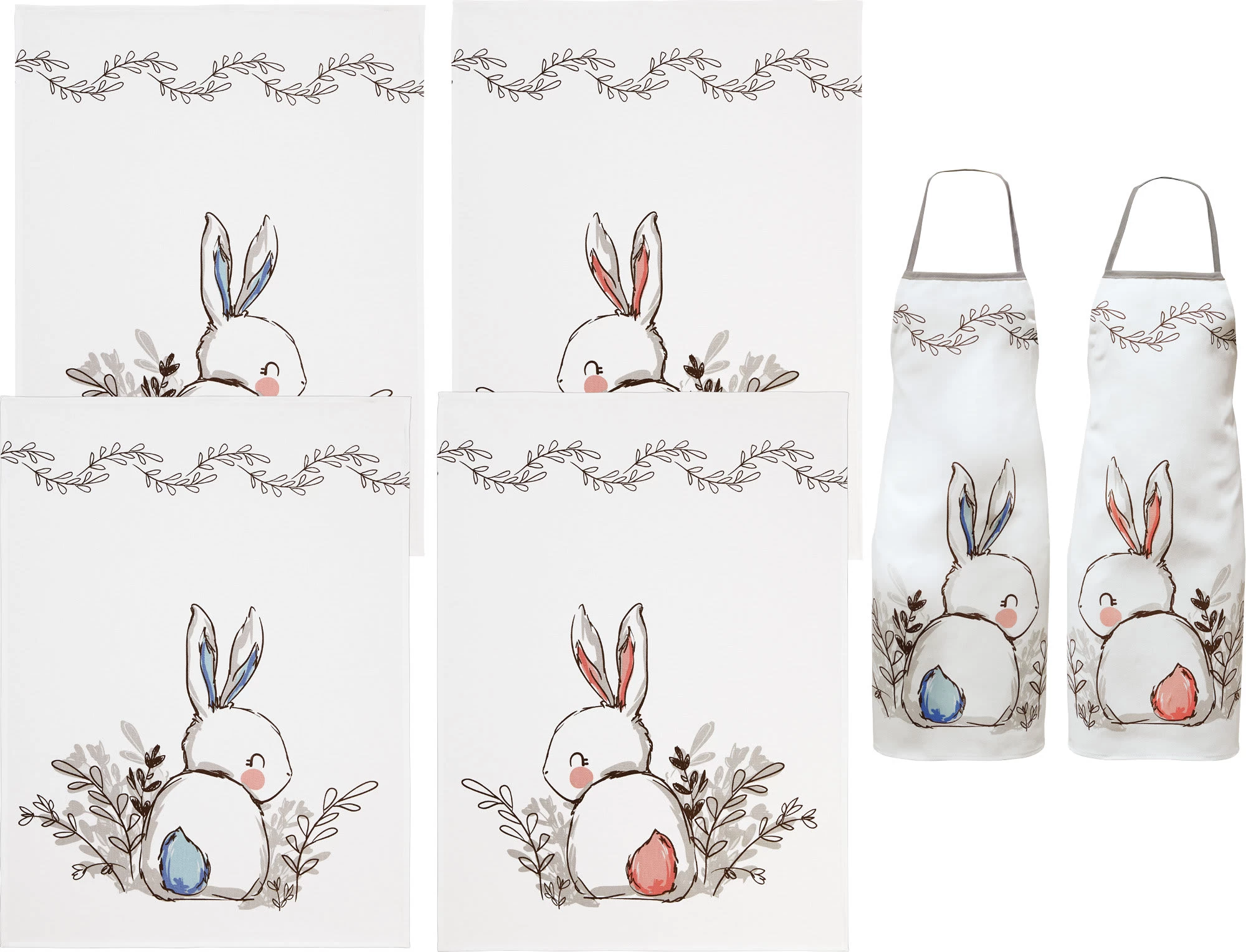 Erwin Müller Küchenset 6-teilig. Es besteht aus zwei Kinderschürzen und Geschirrtüchern im 4er-Pack, jeweils mit süßem Hasen-Motiv.Kinderschürzen: Sie schützen die Kleidung kleiner Kochgehilfen. Durch die Fleckschutzausrüstung ist der Stoff unempfindlicher gegen Schmutz und Flecken. Mit längenverstellbarer Halsschlaufe. 1x rosa und 1x hellblau.