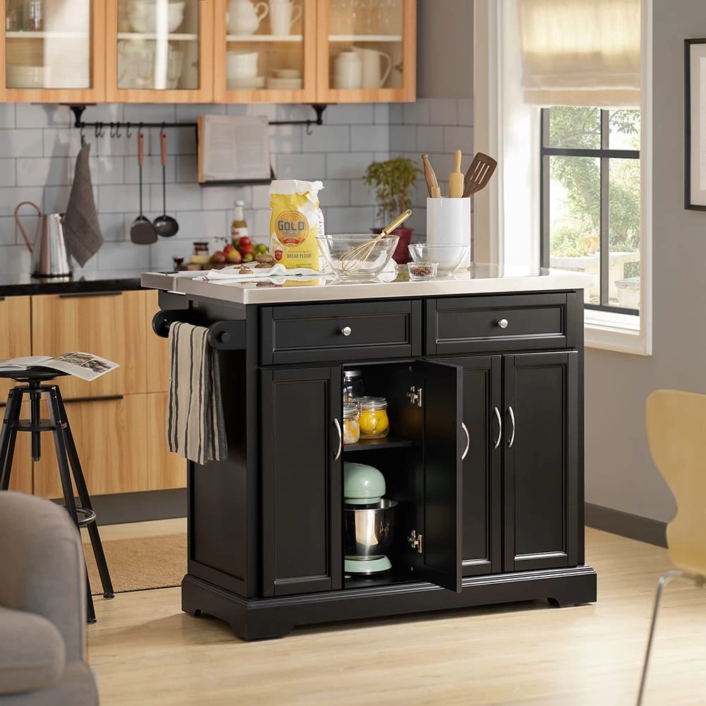 Ausgestattet mit einem Handtuchhalter, zwei geschlossenen Schubladen und zwei Geschirrschränken mit Türen, in denen Sie viele Utensilien verstauen können.