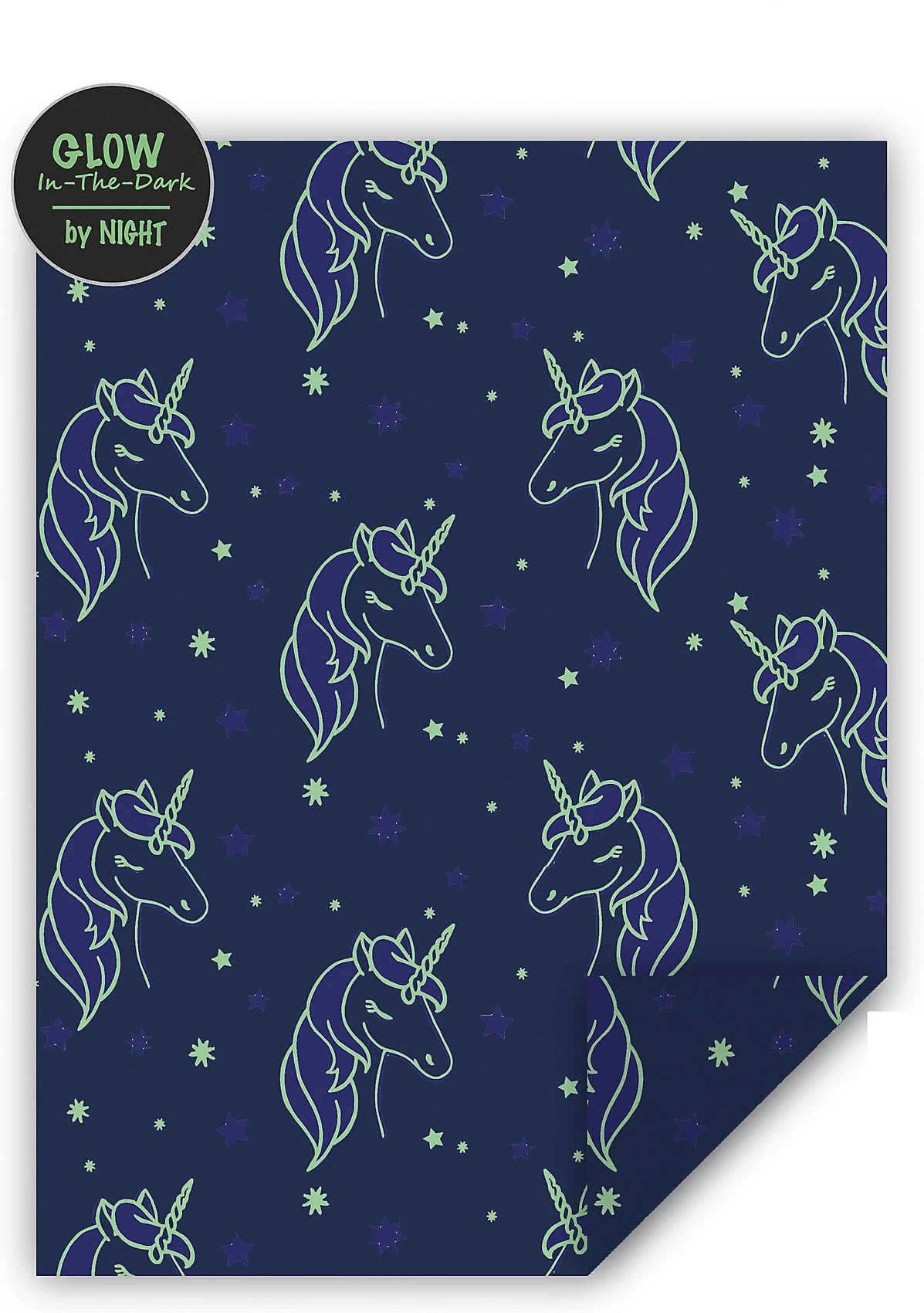 Die besonders flauschige und große Decke lädt zum ausgiebigen Kuscheln ein. Das schöne Motiv wird alle Kleinen und Großen begeistern und die Decke wird schnell zum liebsten Schmuseersatz. Mit ihren großen Maßen von 150 x 200 cm eignet sich die Decke auch wunderbar als Tagesdecke oder Gästedecke. Mit einem ganz besonderen Effekt besticht sie sofort: Das Einhorn-Muster leuchtet im Dunkeln.