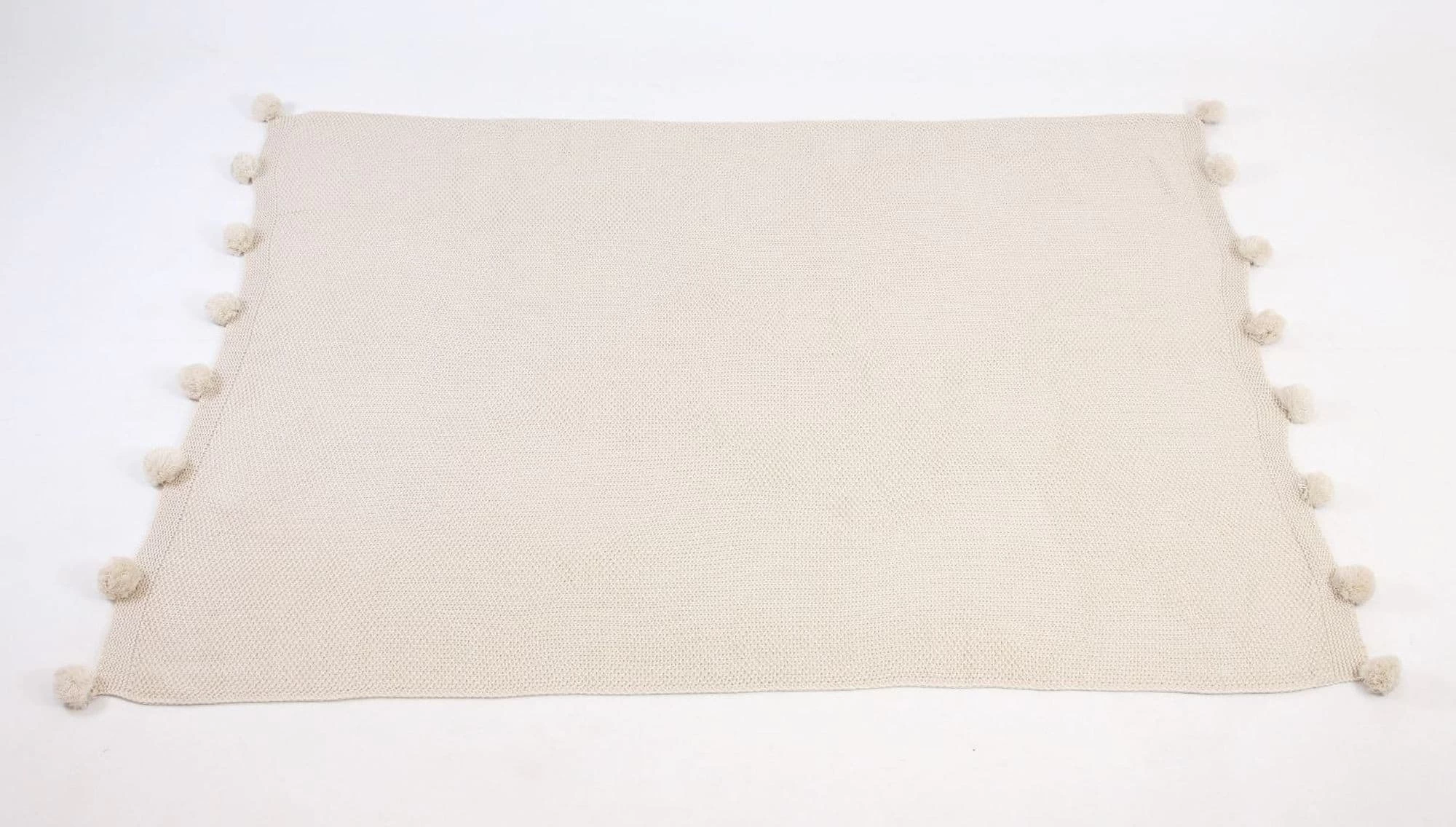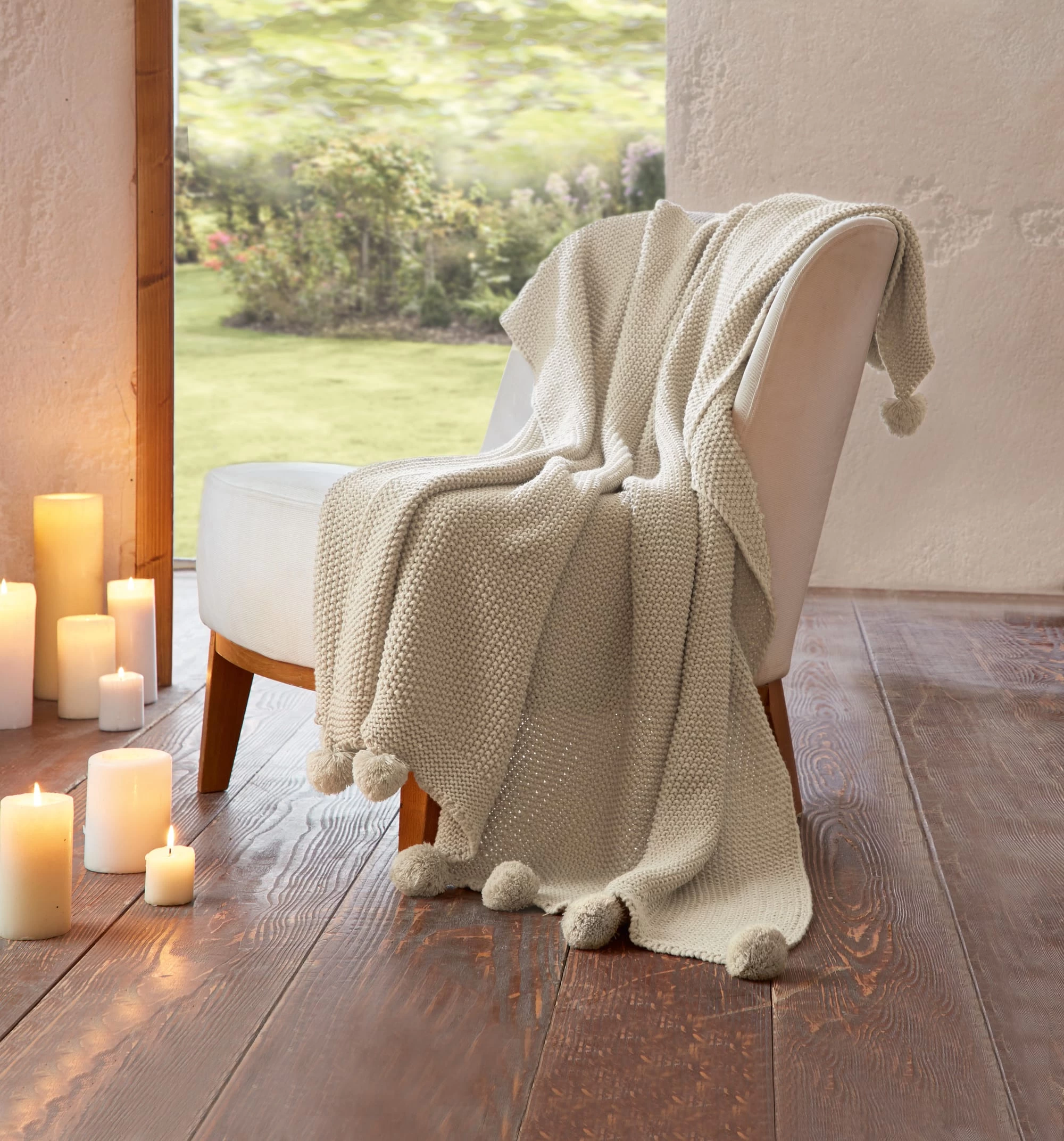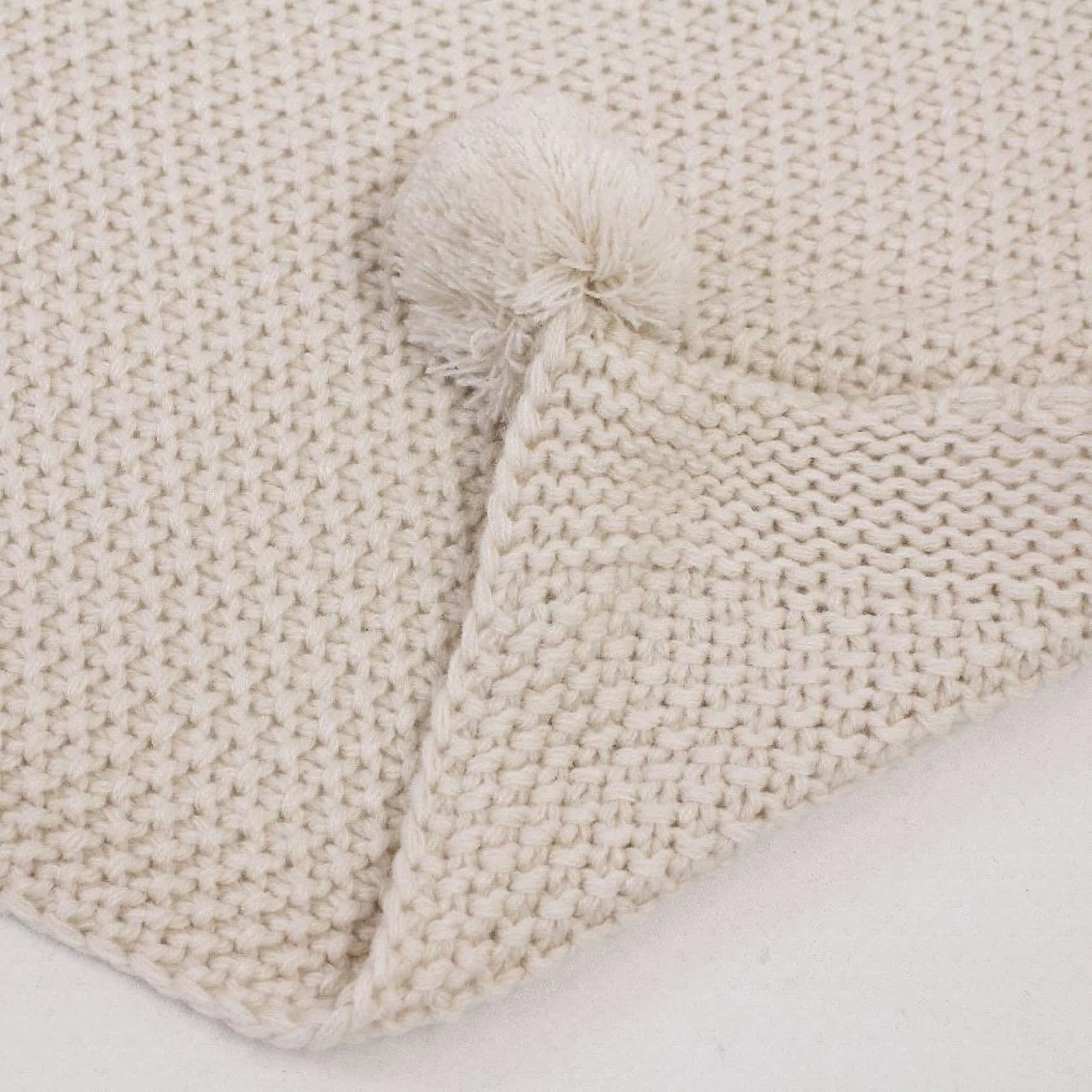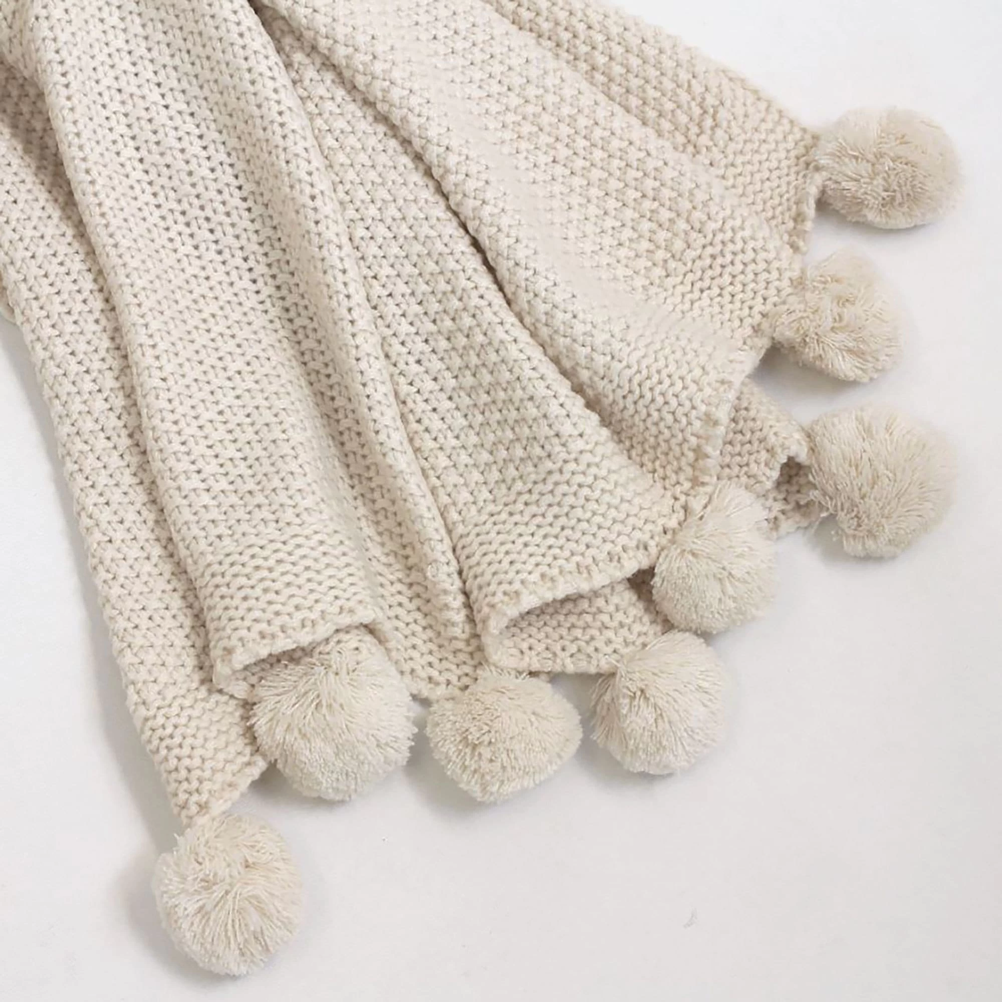 absolutes Must-Have in angesagtem Pompondesign, beigefarbenes Textil aufwändig in anschmiegsamer Stricktechnik gearbeitet, 100% Polyacryl