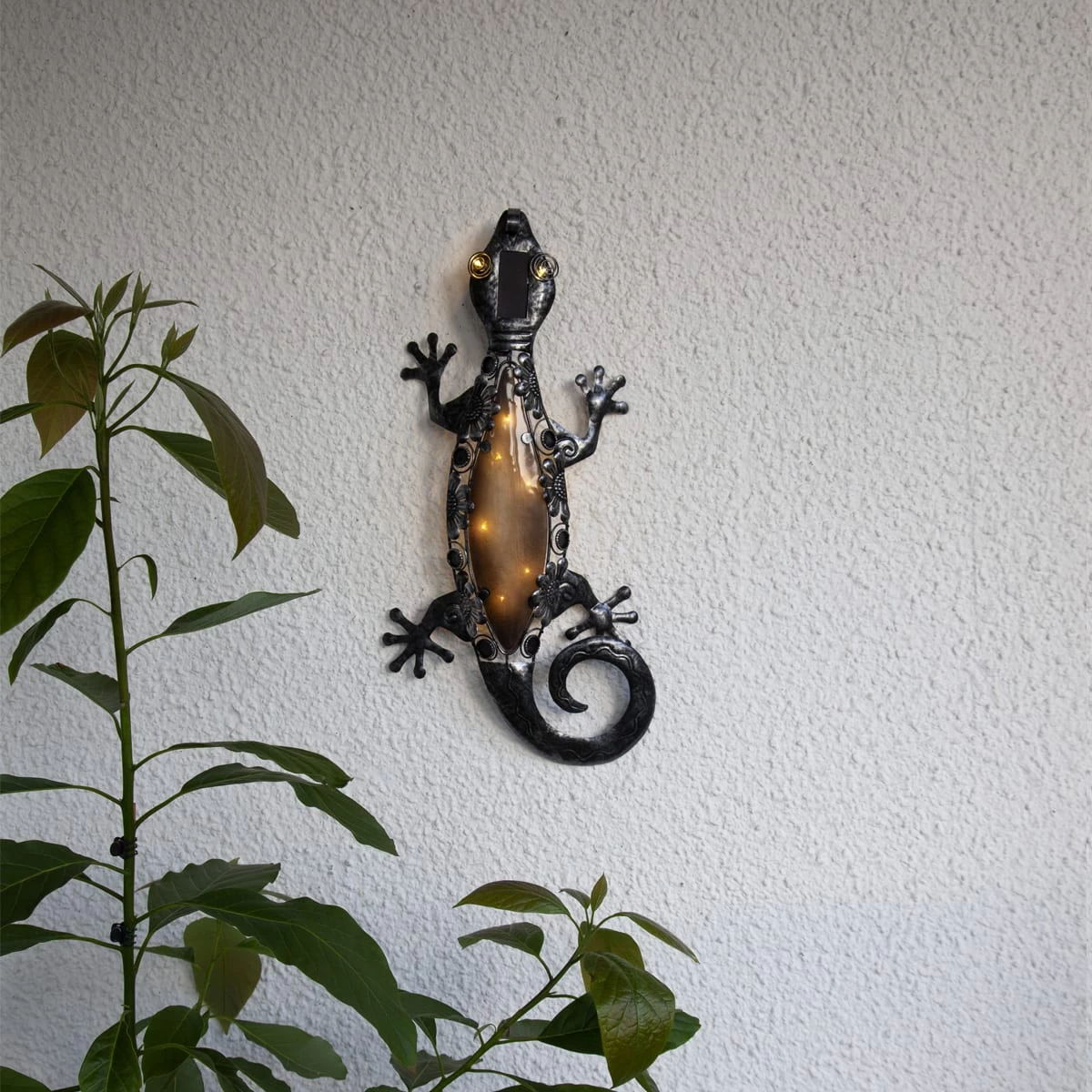 LED Solar Wanddeko GECKO – 10 warmweiße LED – H: 52cm – Dämmerungssensor – schwarz