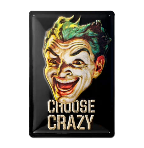 Dieses stylische Blechschild von Logoshirt ist mit der Abbildung von DC Comics‘ Joker aus der Batman-Reihe versehen. Er ist lachend mit typischem Gesichtsausdruck dargestellt und der Slogan „Choose Crazy“ unterlegt das Motiv. Das Schild besitzt an den Ecken eine Ausstanzung zum bequemen Aufhängen.