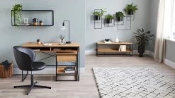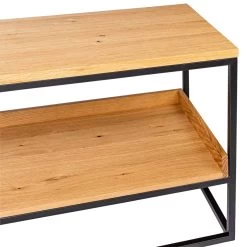 Dieses tolle Lowboard überzeugt durch sein minimalistisches Design. Das schwarze Metallgestell und die Holzelemente im natürlichen Eichenholz-Look harmonieren perfekt – eine schöne Materialkombination, die besonders gut zum urbanen Industrial-Style passt. Das Lowboard ist sehr vielseitig und lässt sich beispielsweise als TV-Tisch oder als Sideboard nutzen.