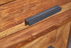 Design Modernes Nachtkästchen im angesagten Industrial-Style Ausgestattet mit zwei Schubladen und einem offenen Ablagefach Robustes und farblich abgesetztes Gestell Abmessungen Breite: 40 cm Tiefe: 35 cm Höhe: 66 cm Innenmaße je Schublade (BxHxT): 31 x 13 x 24,5 cm Innenmaße Ablagefach (BxHxT): 37 x 17 x 35 cm Tischplattenstärke: ca. 1,5 cm Metallstärke: 1,5 cm Weitere Abmessungen finden Sie im Maßbild Farbe Korpus: Braun Gestell und Griffe: Schwarz Besonderheiten Jeder Nachtschrank wurde in liebevoller Handarbeit gefertigt und ist daher ein absolutes Unikat Durch drehbare Holzstopper sind die Schubladen herausnehmbar Die Oberflächen der Nachtkonsole sind mit einem schützenden Klarlack überzogen Aufgrund der Größe ist das Nachtkästchen ideal für Boxspringbetten geeignet Anti-Rutsch-Noppen schützen Ihren Fußboden und das Metall vor unschönen Kratzern Empfohlene Maximalbelastbarkeit: 20 kg Material Korpus: Sheesham Massivholz, mit Klarlack beschichtet Gestell: pulverbeschichtetes Eisen Griffe: Massivholz, schwarz lackiert Lieferumfang Eine Nachtkonsole ohne Dekoration Montage Lieferzustand: komplett montiert und sicher verpackt Pflegehinweise Die Oberfläche mit einem lauwarm angefeuchteten Baumwolltuch reinigen. Keine Scheuermittel, scharfen Reinigungsmittel oder tropfnassen Tücher verwenden.