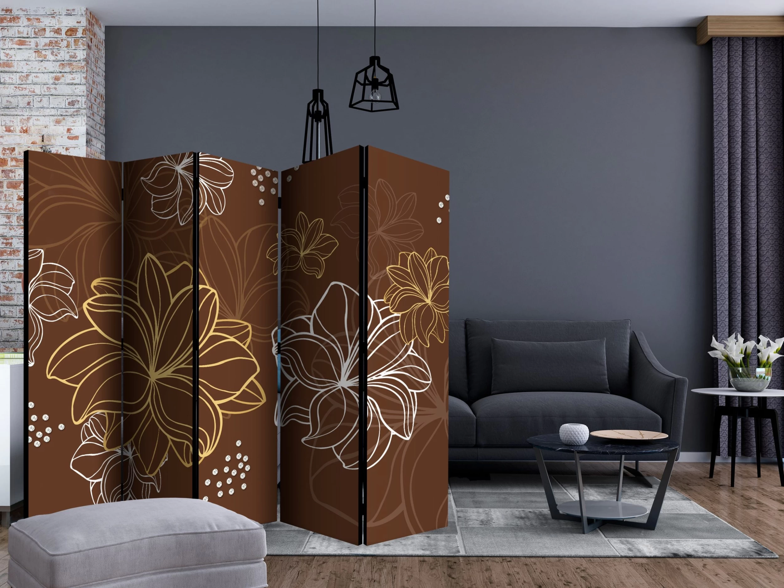Dekoratives Paravent „Autumnal flora II [Room Dividers]“ ist ein besonderes Schmuckstück für die modernen Inneräume. 5-teilig, hergestellt aus Holz und beidseitig bedrucktes Paravent teilt nicht nur diskret den Raum sonder kreiert auch in dem Raum ein fabelhaftes Arrangement. Perfekte Herstellung sowie originelle Motive in der Full HD Druckqualität verursachen, dass die Zimmerparavents jedem Raum einen einmaligen Charme verleihen. Die dekorativen Paravents für die Wohnung, dass ist mit Sicherheit eine originelle Idee für die Dekoration des Innenraumes. Es lohnt sich ihre praktische Anwendung zu erwähnen – die Zimmerparavents kann man z.B. zwecks der Kachierung des Wäschetrockners nutzen. Das Paravent ist eine sehr originelle Dekoration von Räumen, die man nutzen kann, sowohl in der Wohnung wie auch in einem Atelier z.B. im Friseursalon, Arztpraxis oder im Buchhaltungsbüro. Dekoratives Paravent bewährt sich ideal als:Als Zimmerparavent und ein dekoratives Möbelstück, dass den großen Salon vom Speisezimmer und Küche trenntIn einer Ein-Zimmer-Wohnung, in dem es den Tagesraum vom Schlafzimmer trenntAls Paravent für das Schlafzimmer, in dem es z.B. die Kleingarderobe heraustrenntIn Boutiquen und Kosmetiksalons, als orignelles Arrangement und Umkleideraum in Einem!Im gemeinsamen Geschwisterzimmer, als diskrete Trennwand für den RaumIn grossen Wohnungen und Lofts Technische Daten: