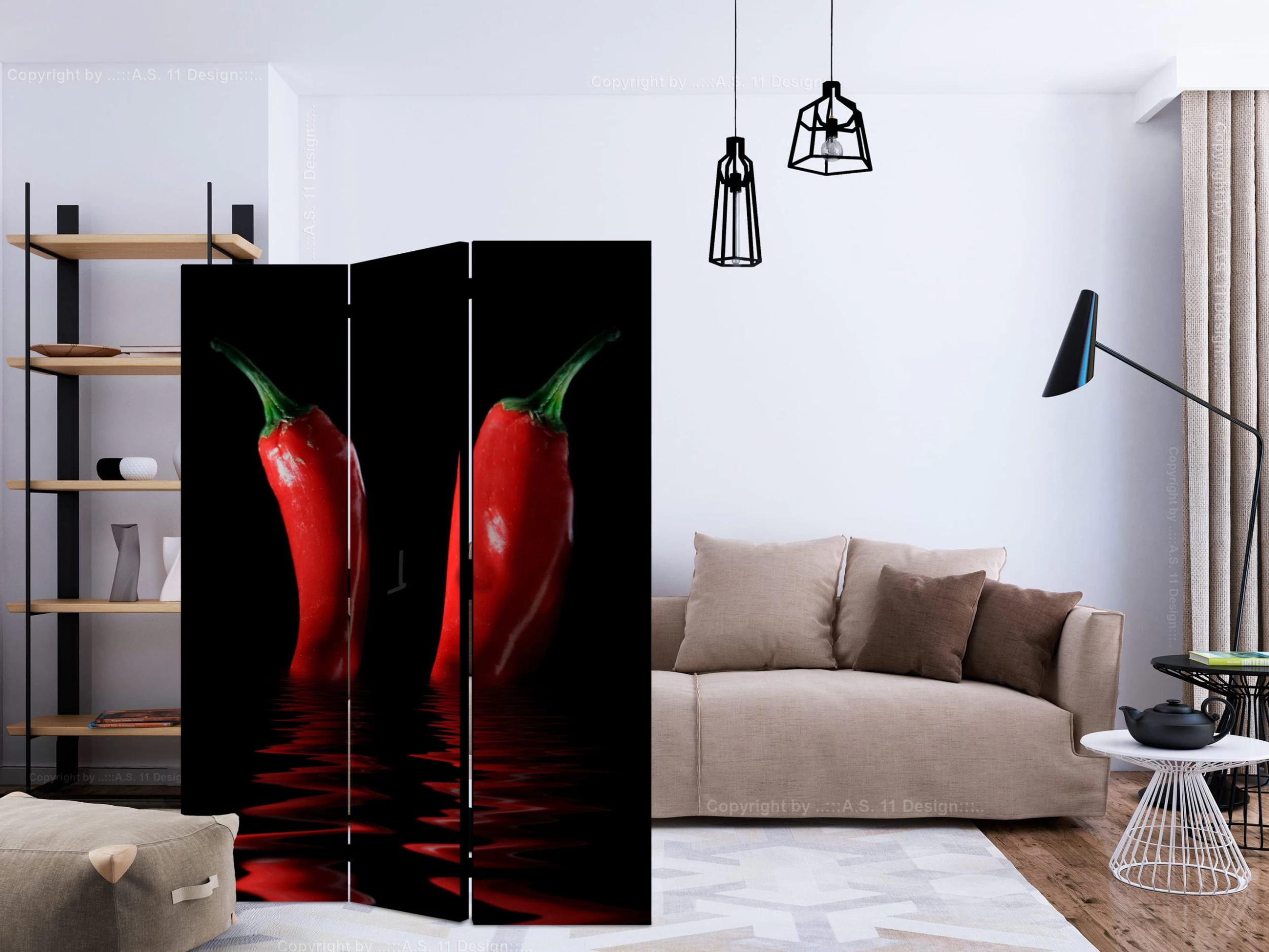 Dekoratives Paravent „Chili pepper [Room Dividers]“ ist ein besonderes Schmuckstück für die modernen Inneräume. 3-teilig, hergestellt aus Holz und beidseitig bedrucktes Paravent teilt nicht nur diskret den Raum sonder kreiert auch in dem Raum ein fabelhaftes Arrangement. Perfekte Herstellung sowie originelle Motive in der Full HD Druckqualität verursachen, dass die Zimmerparavents jedem Raum einen einmaligen Charme verleihen. Die dekorativen Paravents für die Wohnung, dass ist mit Sicherheit eine originelle Idee für die Dekoration des Innenraumes. Es lohnt sich ihre praktische Anwendung zu erwähnen – die Zimmerparavents kann man z.B. zwecks der Kachierung des Wäschetrockners nutzen. Das Paravent ist eine sehr originelle Dekoration von Räumen, die man nutzen kann, sowohl in der Wohnung wie auch in einem Atelier z.B. im Friseursalon, Arztpraxis oder im Buchhaltungsbüro. Dekoratives Paravent bewährt sich ideal als:Als Zimmerparavent und ein dekoratives Möbelstück, dass den großen Salon vom Speisezimmer und Küche trenntIn einer Ein-Zimmer-Wohnung, in dem es den Tagesraum vom Schlafzimmer trenntAls Paravent für das Schlafzimmer, in dem es z.B. die Kleingarderobe heraustrenntIn Boutiquen und Kosmetiksalons, als orignelles Arrangement und Umkleideraum in Einem!Im gemeinsamen Geschwisterzimmer, als diskrete Trennwand für den RaumIn grossen Wohnungen und Lofts Technische Daten: