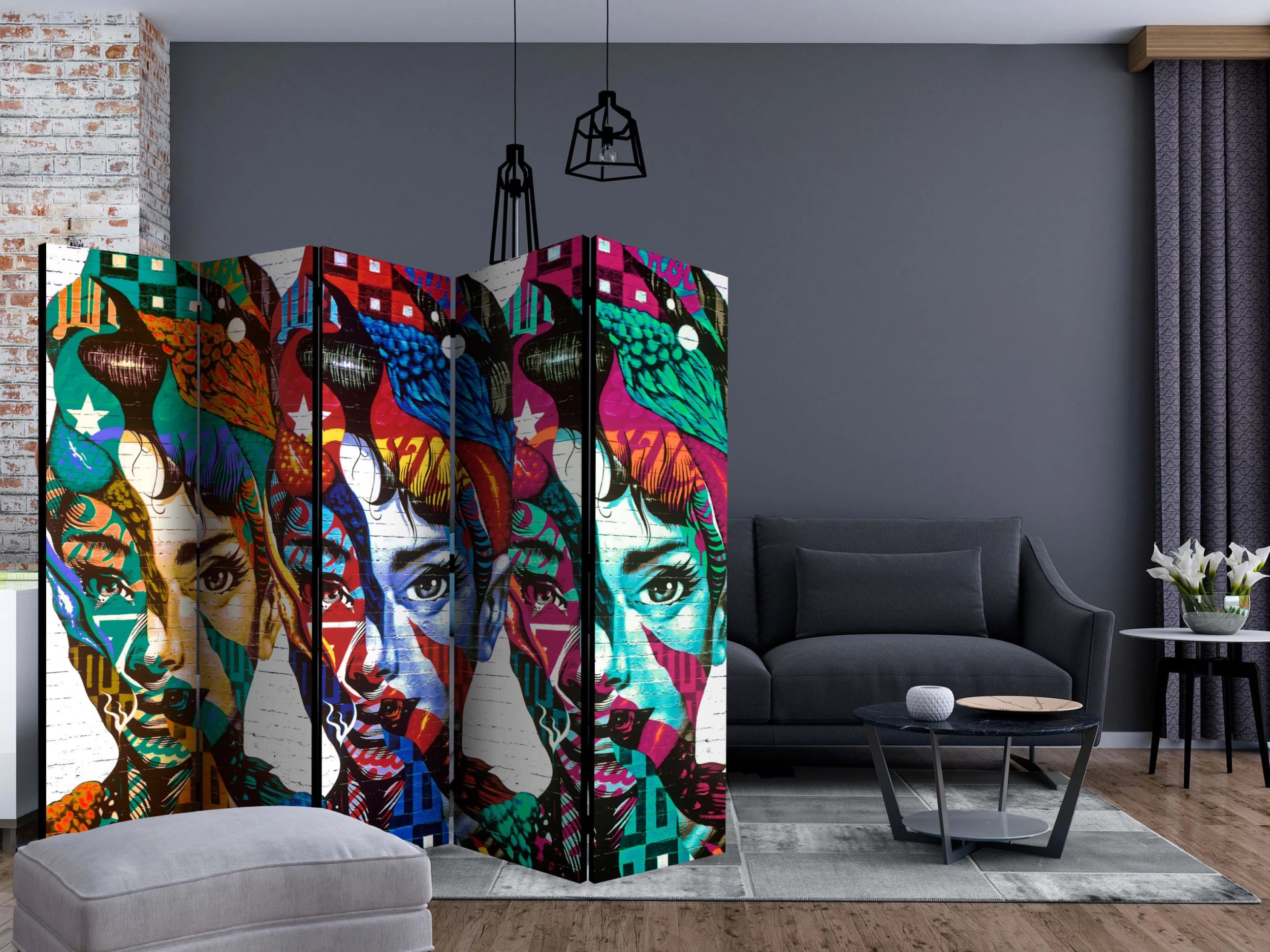 Dekoratives Paravent „Colorful Faces II [Room Dividers]“ ist ein besonderes Schmuckstück für die modernen Inneräume. 5-teilig, hergestellt aus Holz und beidseitig bedrucktes Paravent teilt nicht nur diskret den Raum sonder kreiert auch in dem Raum ein fabelhaftes Arrangement. Perfekte Herstellung sowie originelle Motive in der Full HD Druckqualität verursachen, dass die Zimmerparavents jedem Raum einen einmaligen Charme verleihen. Die dekorativen Paravents für die Wohnung, dass ist mit Sicherheit eine originelle Idee für die Dekoration des Innenraumes. Es lohnt sich ihre praktische Anwendung zu erwähnen – die Zimmerparavents kann man z.B. zwecks der Kachierung des Wäschetrockners nutzen. Das Paravent ist eine sehr originelle Dekoration von Räumen, die man nutzen kann, sowohl in der Wohnung wie auch in einem Atelier z.B. im Friseursalon, Arztpraxis oder im Buchhaltungsbüro. Dekoratives Paravent bewährt sich ideal als:Als Zimmerparavent und ein dekoratives Möbelstück, dass den großen Salon vom Speisezimmer und Küche trenntIn einer Ein-Zimmer-Wohnung, in dem es den Tagesraum vom Schlafzimmer trenntAls Paravent für das Schlafzimmer, in dem es z.B. die Kleingarderobe heraustrenntIn Boutiquen und Kosmetiksalons, als orignelles Arrangement und Umkleideraum in Einem!Im gemeinsamen Geschwisterzimmer, als diskrete Trennwand für den RaumIn grossen Wohnungen und Lofts Technische Daten: